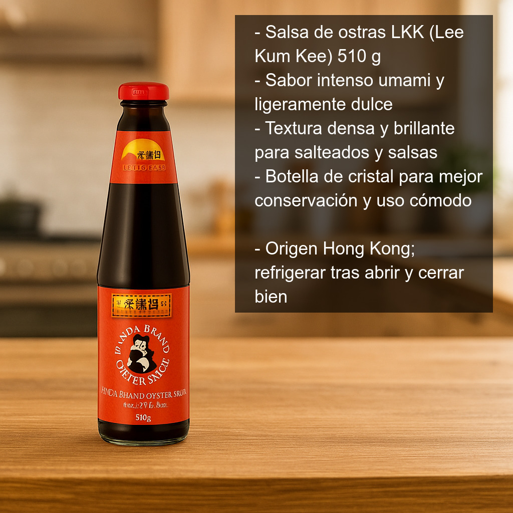 Esta salsa de ostras LKK (Lee Kum Kee), una de las marcas más reconocidas a nivel mundial, se presenta en botella de cristal para una mejor conservación y un uso cómodo en cocina. Ideal para quienes buscan un ingrediente auténtico para preparar recetas chinas y asiáticas en casa.