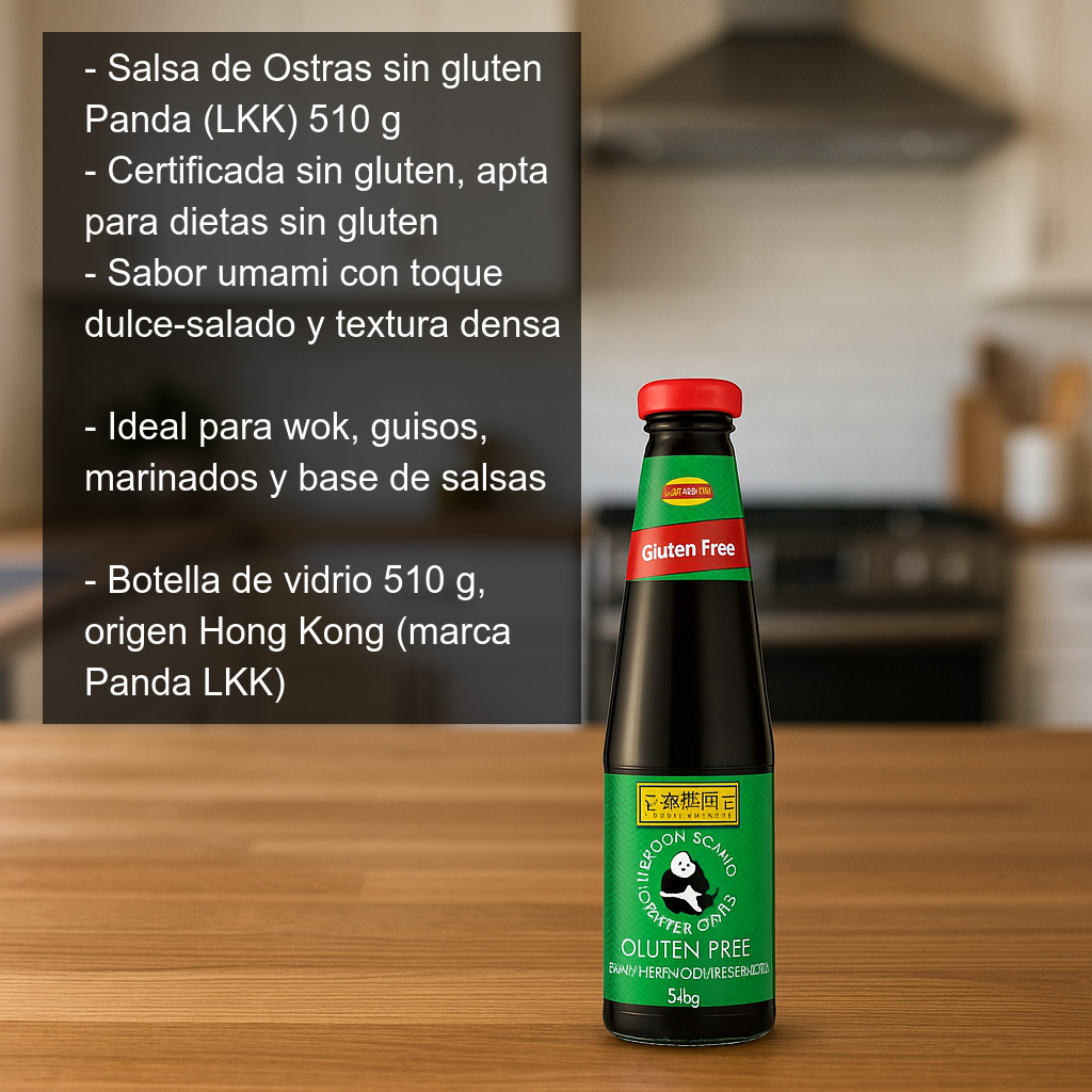 Esta salsa de ostras se presenta en botella de vidrio de 510 g. Origen: Hong Kong. Pertenece a la marca Panda de LKK, famosa en todo el mundo por su salsa de ostras.