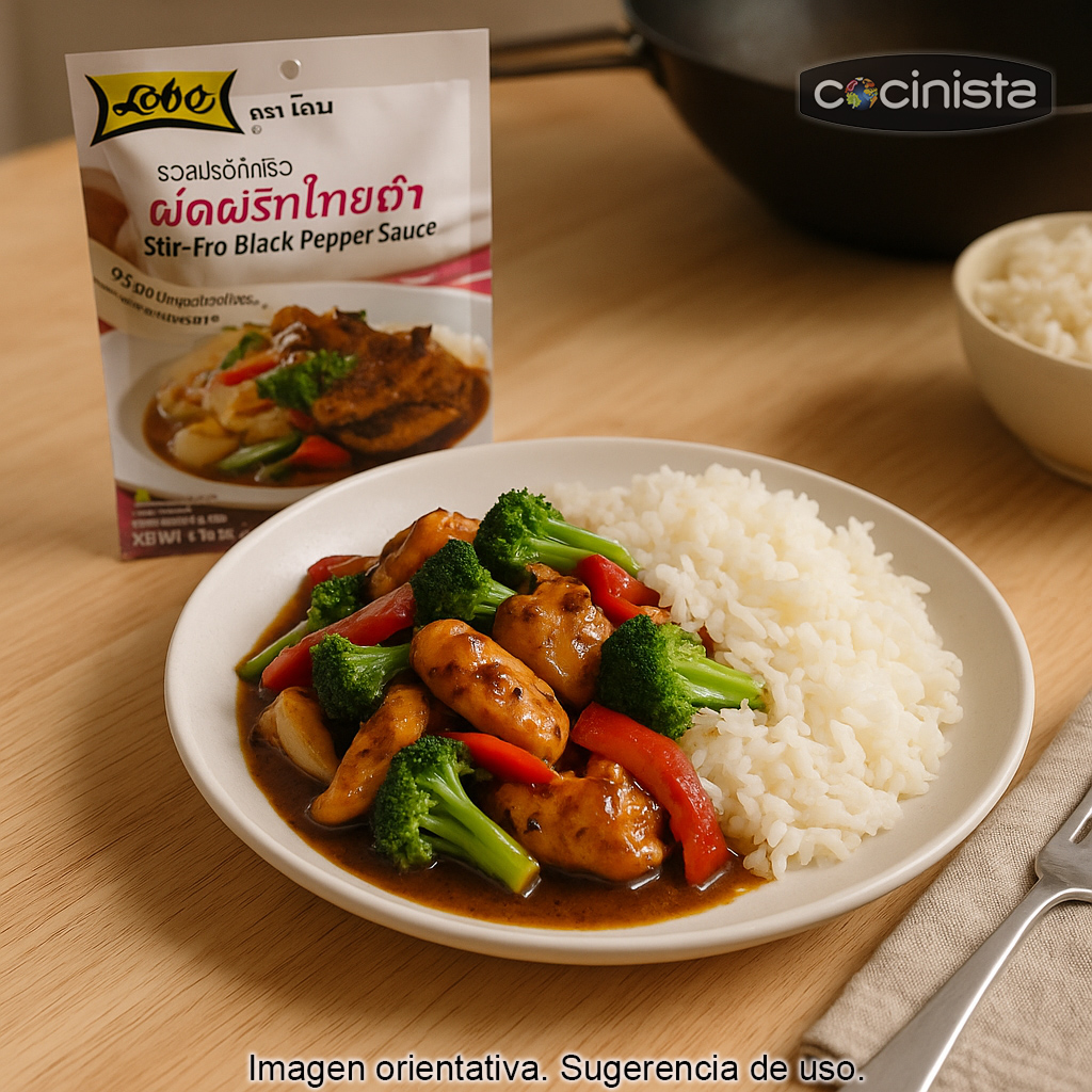 Perfecta para quienes buscan una salsa para wok rápida y sabrosa, esta mezcla te permite conseguir un plato completo en pocos minutos: proteína + verduras + salsa, con un resultado equilibrado y muy apetecible.