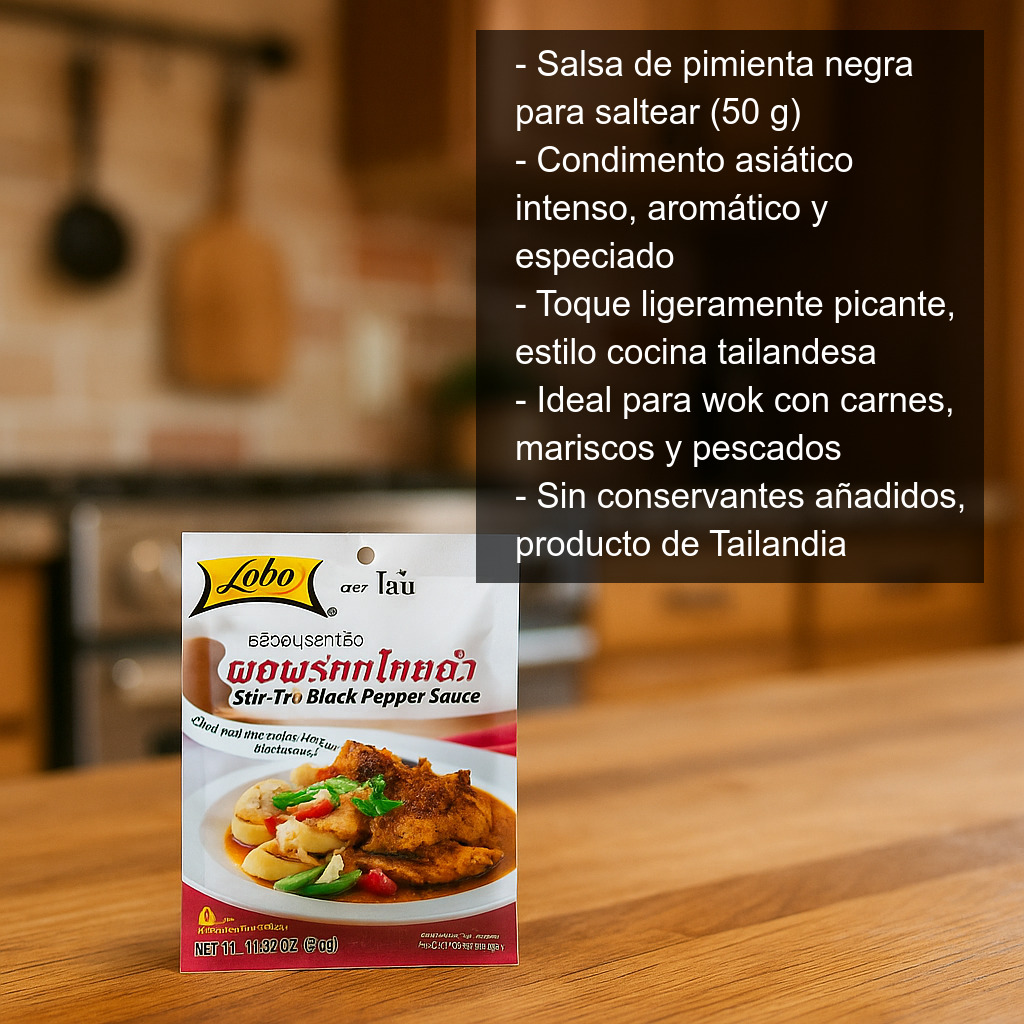 La salsa de pimienta negra para saltear (50 g) es un condimento de estilo asiático, intenso y aromático, ideal para preparar en casa salteados tipo wok con un toque especiado y ligeramente picante. Su sabor combina especialmente bien con carnes (ternera, pollo, cerdo), mariscos (gambas, calamar) y pescados, aportando ese característico perfil de la cocina tailandesa.