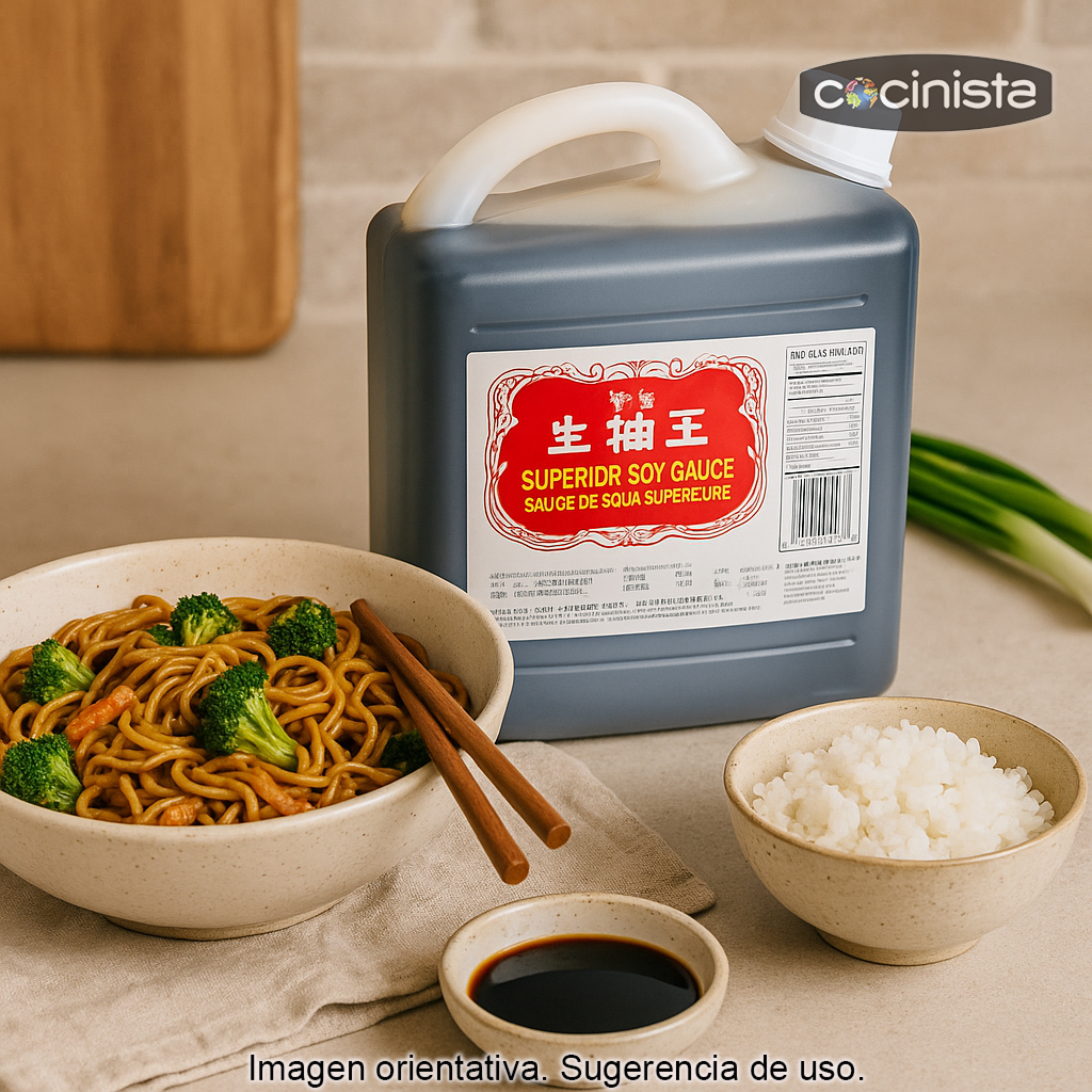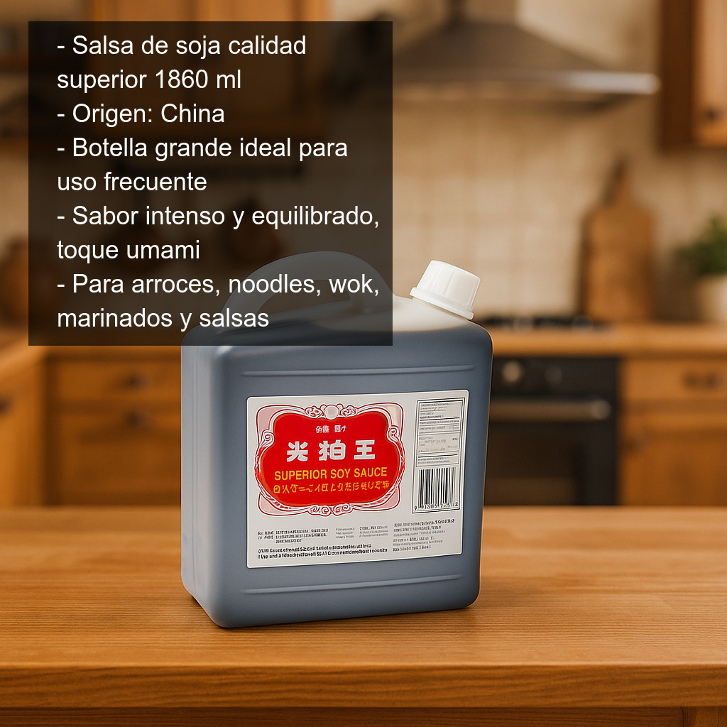 Salsa de soja de calidad superior elaborada en China, presentada en un práctico formato grande de 1,86 litros (1860 ml), ideal para quienes cocinan a menudo y buscan un condimento versátil para el día a día. Su sabor intenso y equilibrado la convierte en un básico imprescindible en cualquier despensa, especialmente en cocina asiática.