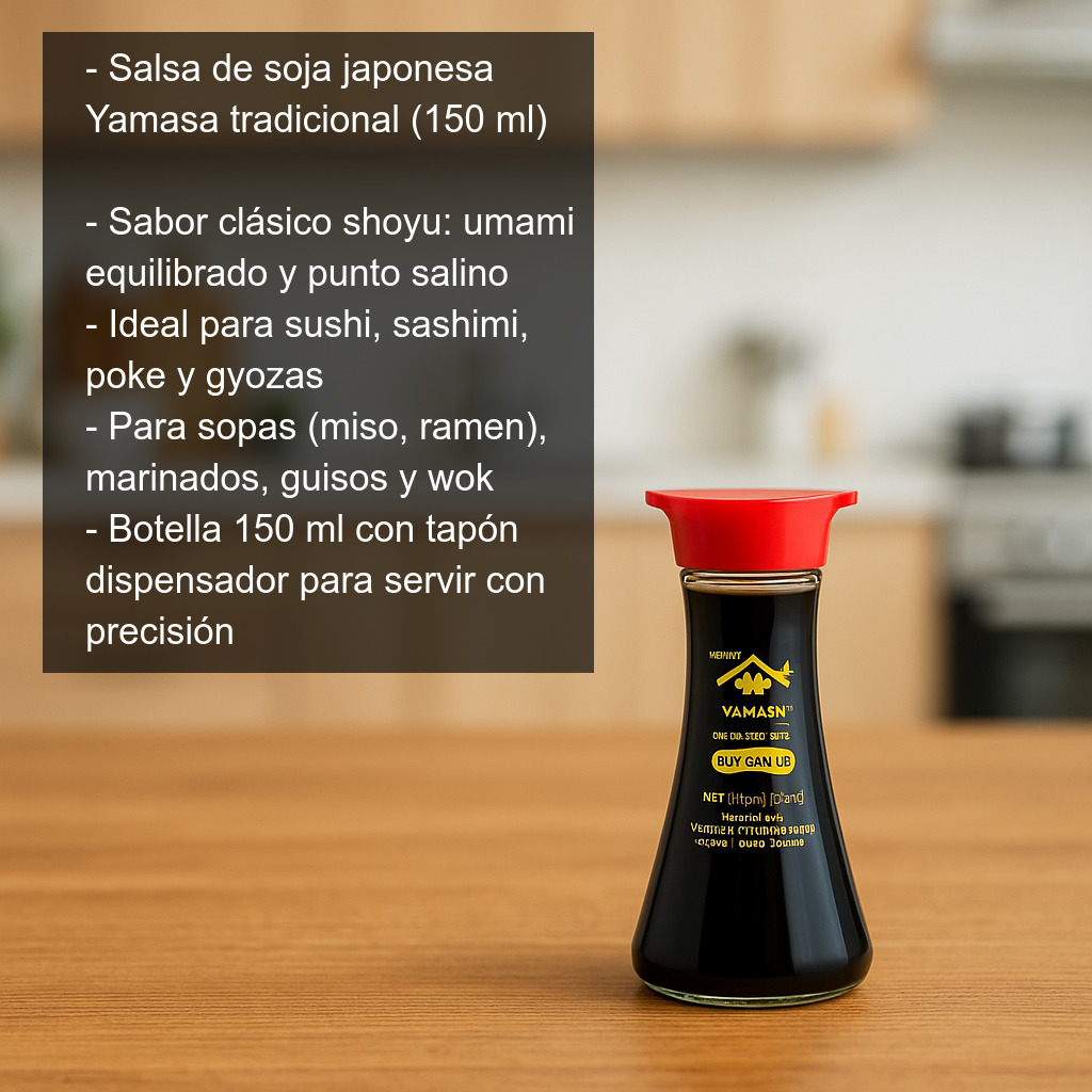 Salsa de soja japonesa tradicional (150 ml) de excelente calidad, ideal para quienes buscan el sabor clásico de la shoyu para cocinar y para la mesa. Su perfil equilibrado, con notas umami y un punto salino agradable, la convierte en un básico imprescindible tanto en recetas asiáticas como en platos cotidianos.