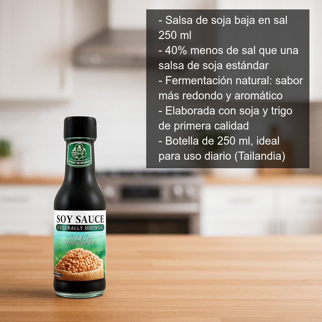 La salsa de soja baja en sal (250 ml) es una opción perfecta para quienes desean disfrutar del sabor característico de la soja con una reducción del 40% de sal. Ideal para cocinar a diario, para dietas con control de sodio o simplemente para quienes prefieren un condimento más suave sin renunciar al toque umami.