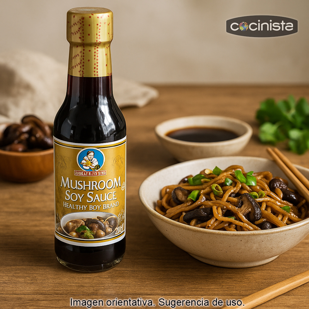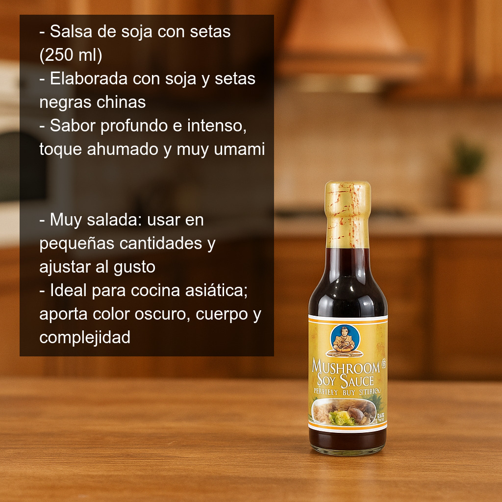 La salsa de soja con setas (250 ml) es una variante especialmente aromática de la salsa de soja tradicional, elaborada a partir de salsa de soja y setas negras chinas. El resultado es un condimento de sabor más profundo e intenso que la soja sola, con un ligero toque ahumado y un perfil muy umami. Ten en cuenta que es bastante salada, por lo que conviene usarla en pequeñas cantidades para potenciar el sabor sin pasarse.