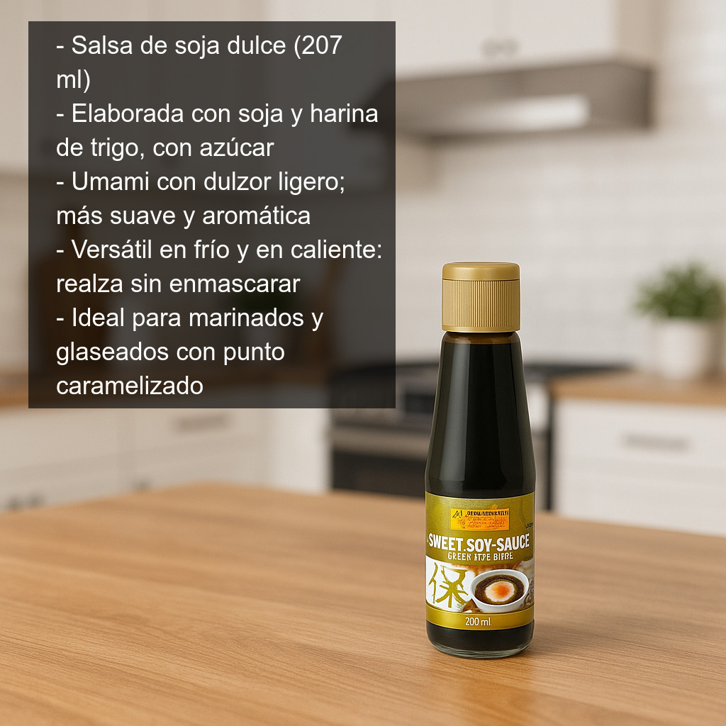 La salsa de soja dulce (207 ml) es un condimento imprescindible en la cocina asiática y de fusión. Elaborada de forma tradicional a partir de granos de soja y harina de trigo, incorpora un toque de azúcar que aporta un dulzor agradable y equilibrado, ideal para quienes buscan una salsa de soja más suave, aromática y redonda en boca.