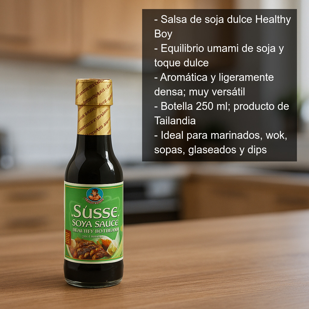 Esta salsa de soja dulce Healthy Boy es ideal para dar profundidad y brillo a tus recetas, aportando un acabado sabroso y redondeado tanto en platos salados como en preparaciones con matices agridulces.