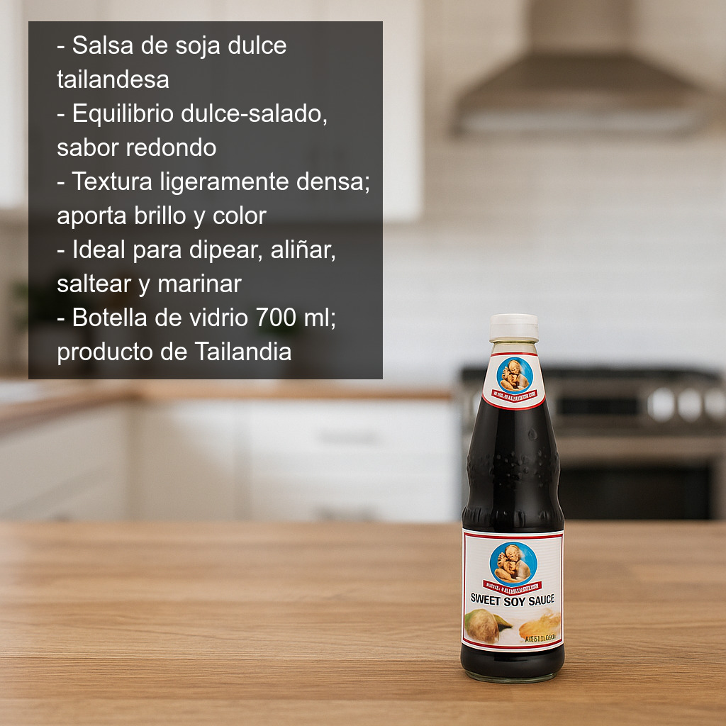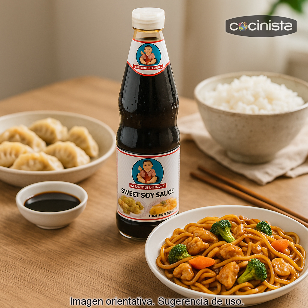 Esta salsa de soja dulce tailandesa es ideal para quienes buscan una salsa versátil para el día a día: funciona como dipping para aperitivos, como aliño para ensaladas y bowls, y como base para salteados, marinados y guisos. Su perfil dulce-salado combina especialmente bien con carnes, pollo, verduras, tofu y fideos.