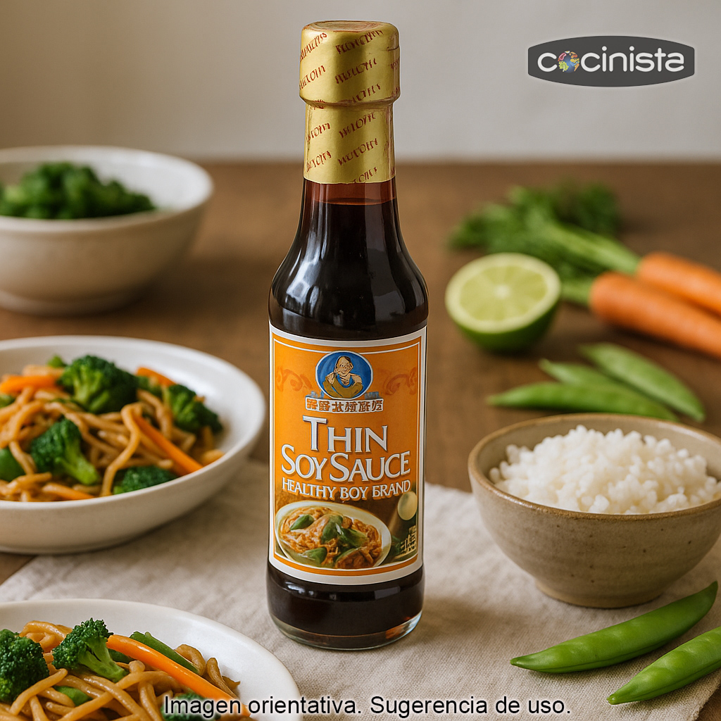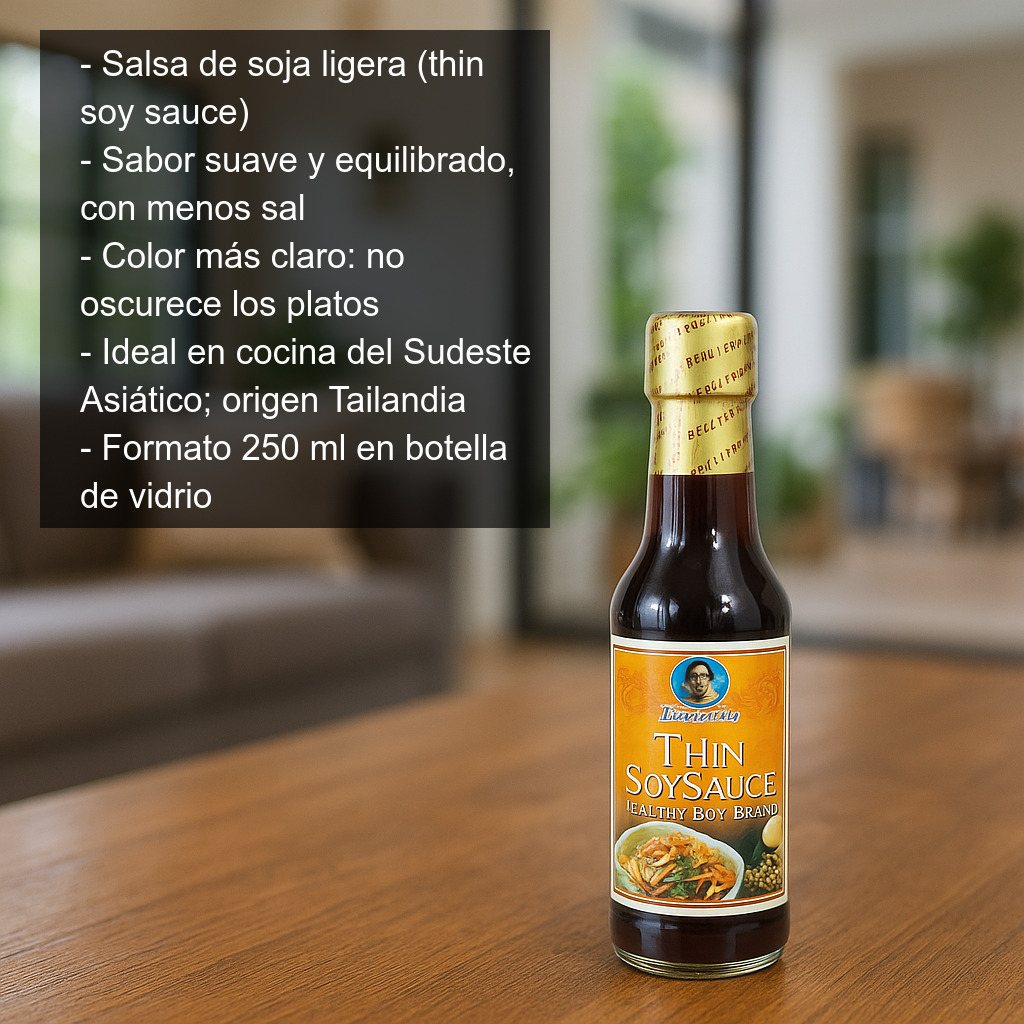 La salsa de soja ligera (conocida en inglés como "thin soy sauce") es una variedad de salsa de soja más clara y menos densa que la salsa de soja tradicional. Su sabor es más suave y equilibrado, con menos sal, lo que la convierte en una opción muy versátil para quienes buscan realzar el sabor de los platos sin oscurecerlos ni dominarlos. Es un ingrediente muy habitual en la cocina del Sudeste Asiático, especialmente en Tailandia, de donde procede este producto.
