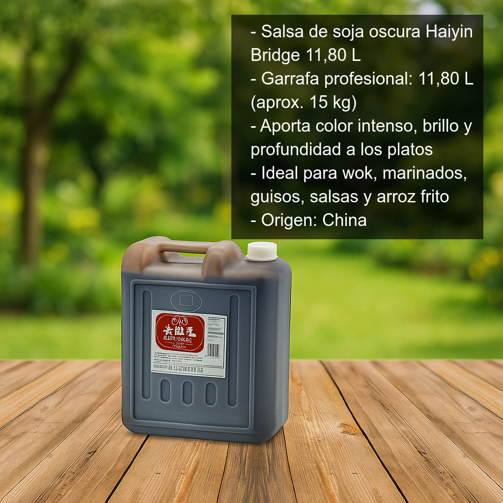 Salsa de soja oscura Haiyin Bridge en formato profesional, presentada en garrafa de plástico de 11,80 litros (aprox. 15 kg). Se trata de una salsa de soja oscura de estilo asiático, especialmente indicada para restaurantes, cocinas profesionales, caterings y también para grandes consumidores que buscan un formato de alto rendimiento.