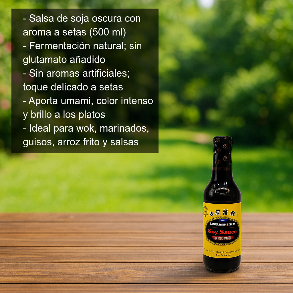 La salsa de soja oscura con aroma a setas (500 ml) es un condimento imprescindible para quienes buscan aportar a sus platos un sabor profundo, umami y un color más intenso. Se trata de una salsa de soja fermentada de forma natural, elaborada sin glutamato añadido y sin aromas artificiales, con un delicado toque a setas que redondea el perfil y la hace especialmente versátil en cocina.