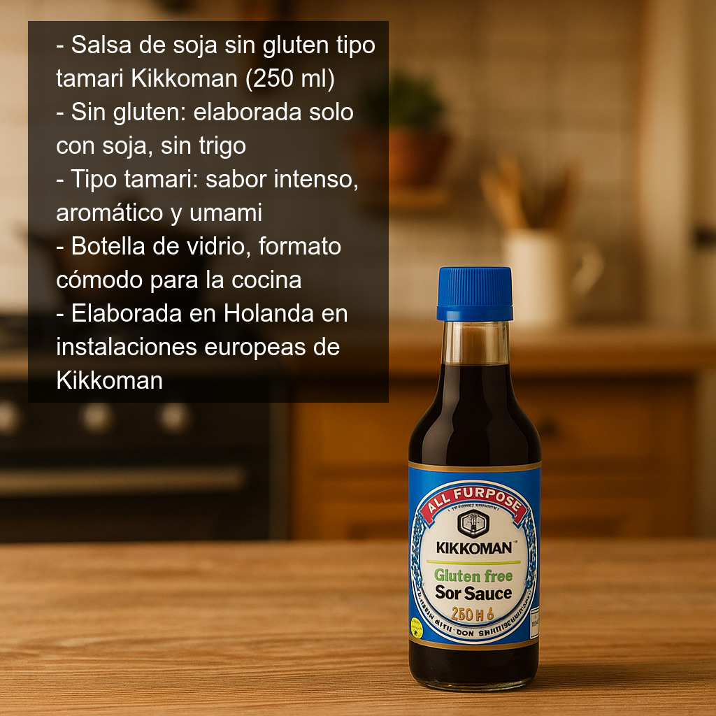 Salsa de soja sin gluten tipo tamari Kikkoman (250 ml). Disfruta del sabor intenso y equilibrado de una auténtica salsa de soja japonesa, elaborada exclusivamente a partir de soja y sin trigo. Al no contener gluten, es una opción ideal para personas celíacas o para quienes desean reducir o evitar el consumo de gluten sin renunciar al umami característico de la soja fermentada.