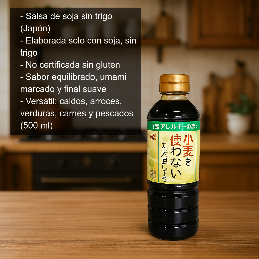 Descubre una salsa de soja sin trigo elaborada en Japón a partir de soja exclusivamente, pensada para quienes buscan el sabor auténtico de la cocina japonesa con un perfil más limpio y ligero que el de la salsa de soja tradicional. Al no contener trigo en su formulación, es una opción interesante para recetas en las que se desea evitar este cereal, aunque no está certificada como sin gluten.