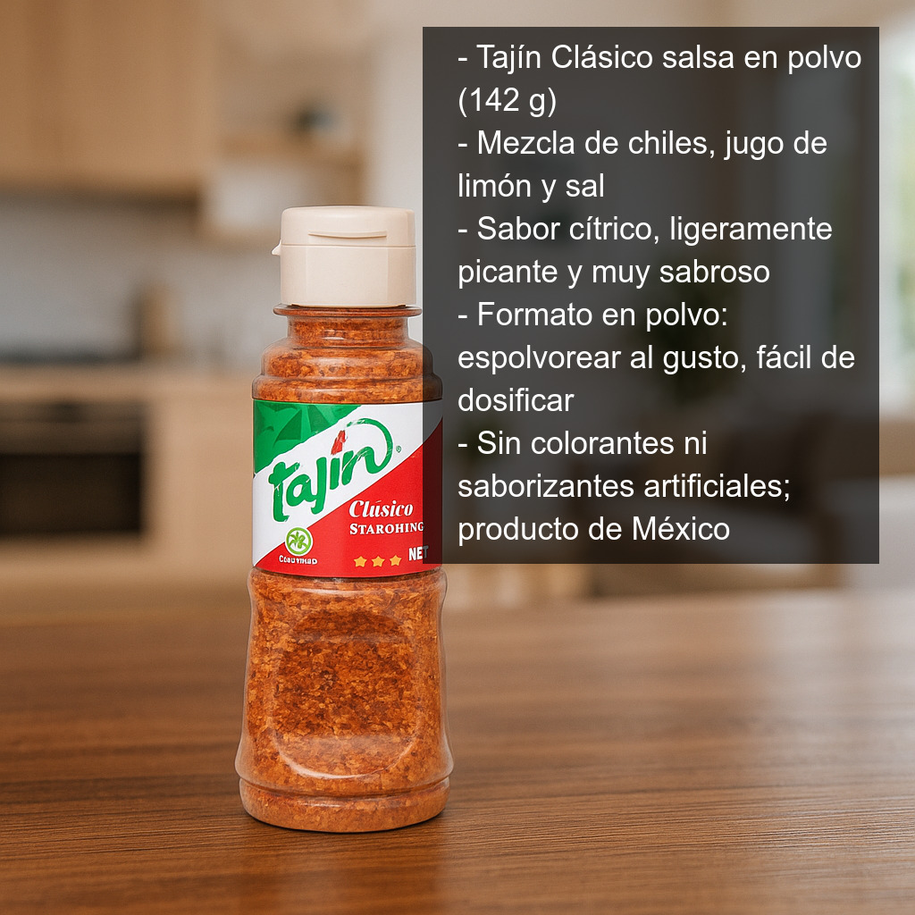 - Presentación: botella característica de Tajín, práctica para dosificar