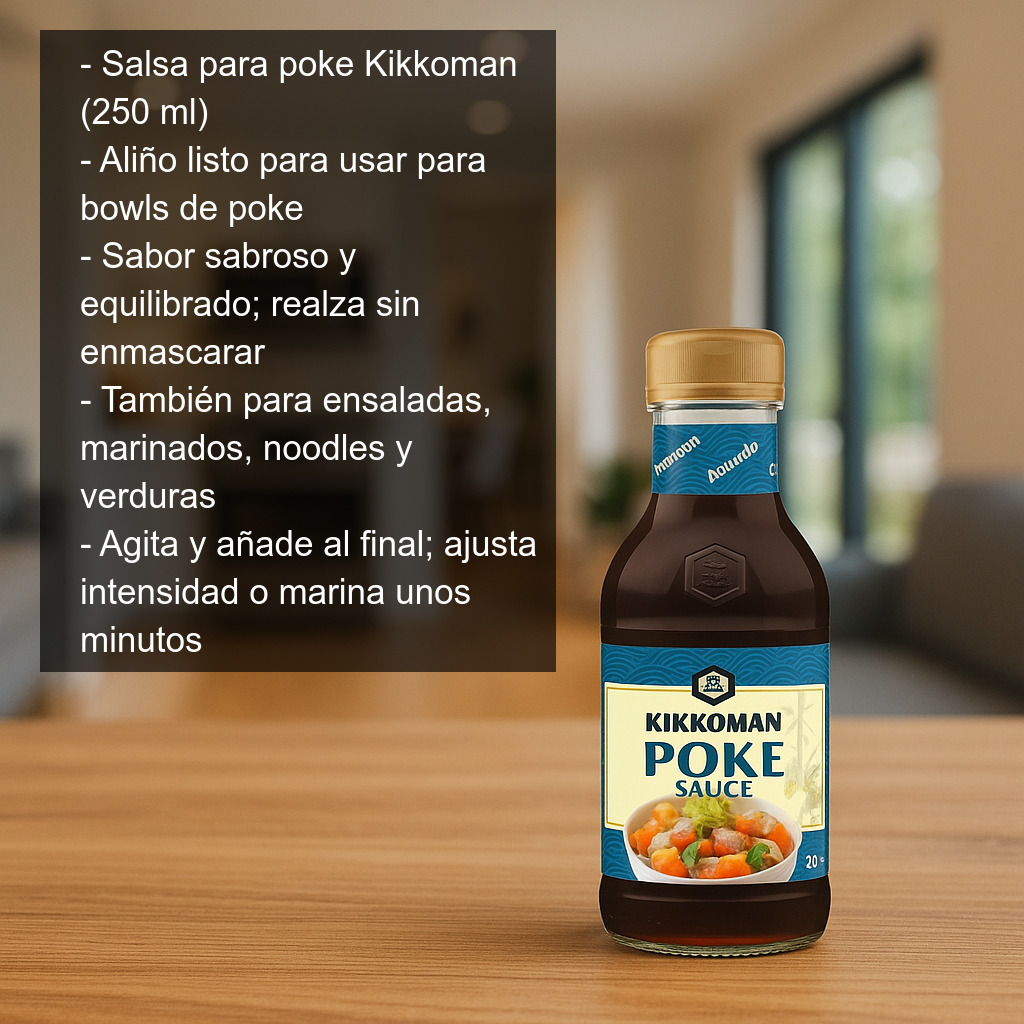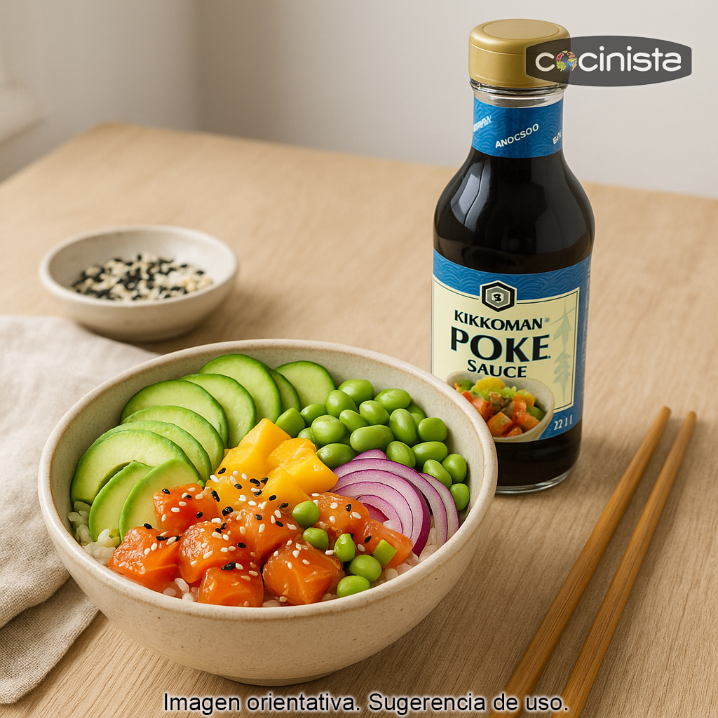 La salsa para poke Kikkoman (250 ml) es el aliño ideal para dar el toque final a tus bowls de poke y a muchas otras recetas de inspiración asiática. El poke, conocido como el “sushi hawaiano”, combina arroz, pescado (atún o salmón), verduras y toppings crujientes; para que el conjunto quede equilibrado, necesita una salsa que aporte sabor, brillo y un punto irresistible. Esta salsa está pensada precisamente para eso: realzar los ingredientes sin enmascararlos.