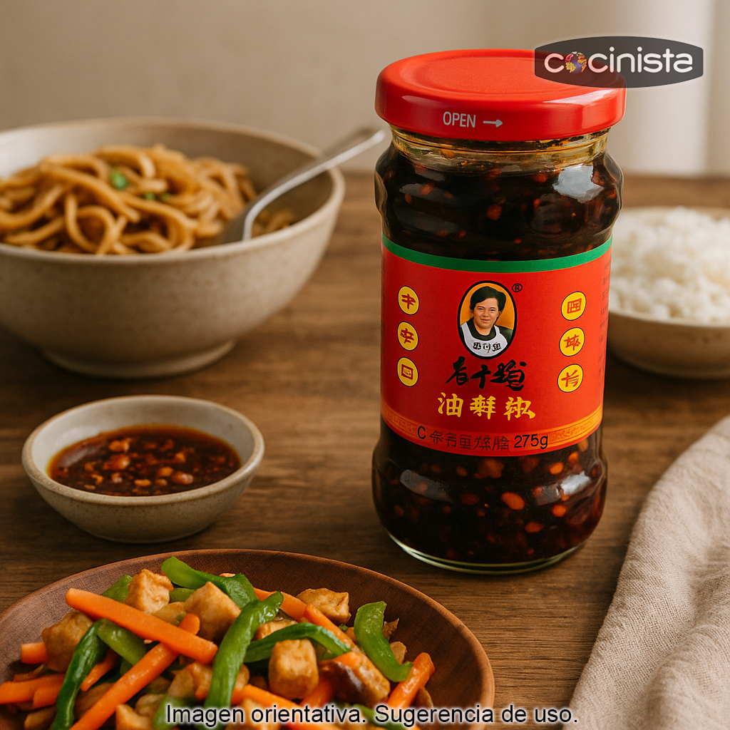 Elaborada a partir de una base de aceite de soja y chile rojo, esta salsa ofrece un picante persistente y fragante, ideal para quienes buscan una salsa de chile con tropezones que transforme platos sencillos en recetas llenas de carácter. Los cacahuetes añaden un punto crujiente y un sabor ligeramente tostado que combina especialmente bien con noodles, arroces y salteados.