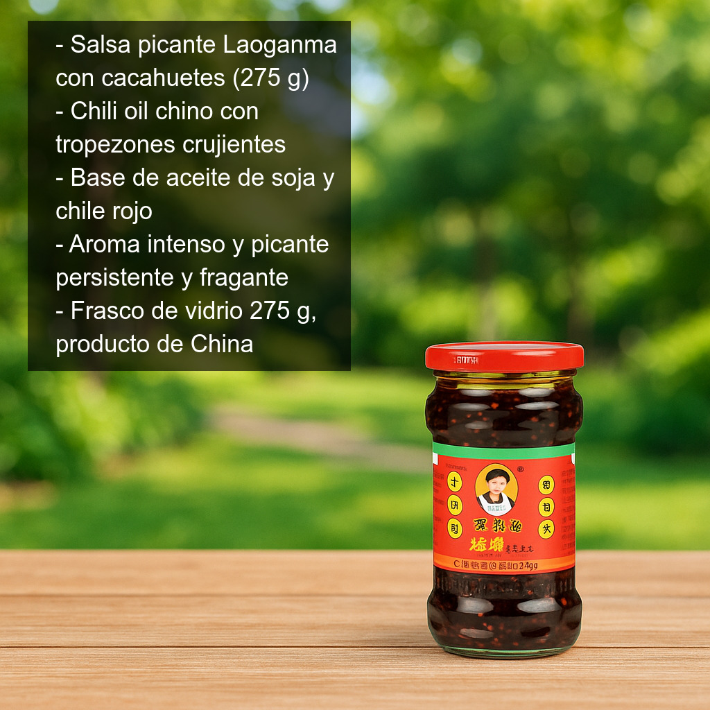 La salsa picante Laoganma con cacahuetes (275 g) es una de las salsas de chile chinas más populares y reconocibles, famosa por su textura crujiente, su aroma intenso y su equilibrio entre picante y sabor tostado. Esta variedad combina el característico aceite de chile de Laoganma con cacahuetes, aportando una consistencia muy agradable y un toque extra de profundidad.