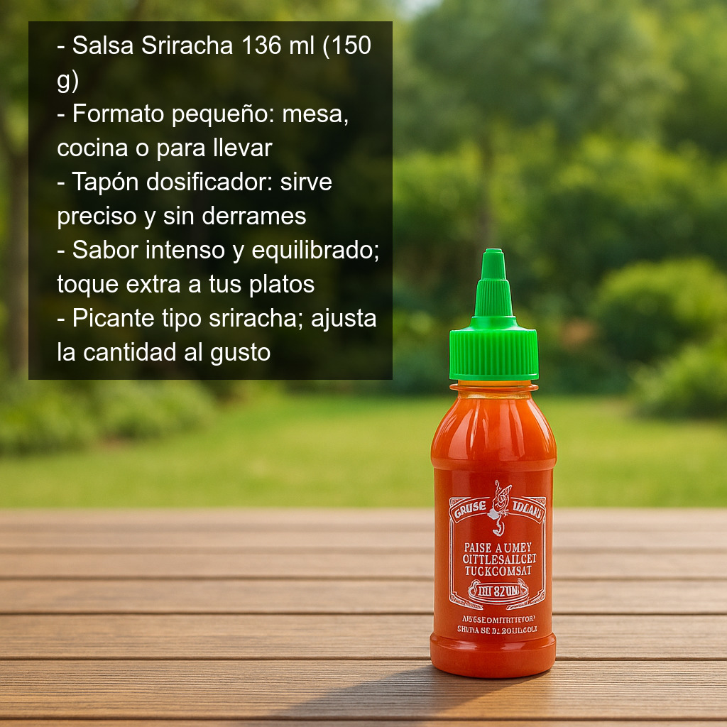 La Salsa Sriracha en formato pequeño (botella de 136 ml / 150 g) es perfecta para tener siempre a mano en la mesa, en la cocina o para llevar a comidas y cenas con amigos. Su práctico tapón dosificador permite servir la cantidad justa, sin derrames, y controlar fácilmente el nivel de picante en cada plato.
