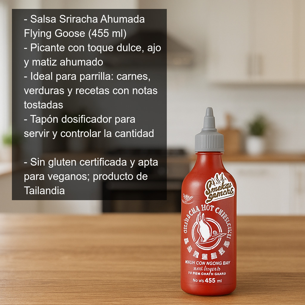La salsa Sriracha es un gran clásico de la cocina tailandesa, famosa por su equilibrio entre picante, un ligero toque dulce y el aroma característico del ajo. Esta versión de Salsa Sriracha Ahumada Flying Goose añade un matiz extra: un delicioso toque ahumado que potencia el sabor y aporta profundidad, ideal para quienes buscan una salsa picante ahumada versátil y con personalidad.