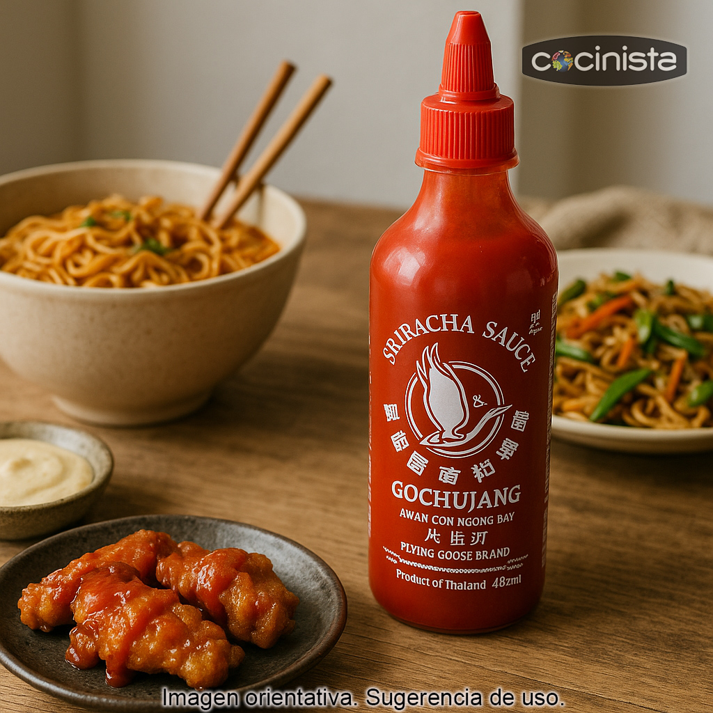 La Salsa Sriracha con Gochujang es una deliciosa propuesta de cocina fusión asiática que une dos iconos del picante: la clásica salsa Sriracha tailandesa y la intensa pasta de chile Gochujang coreana. El resultado es una salsa equilibrada de picante medio, muy aromática, con un agradable toque dulce y un punto umami que la hace especialmente versátil en la cocina.