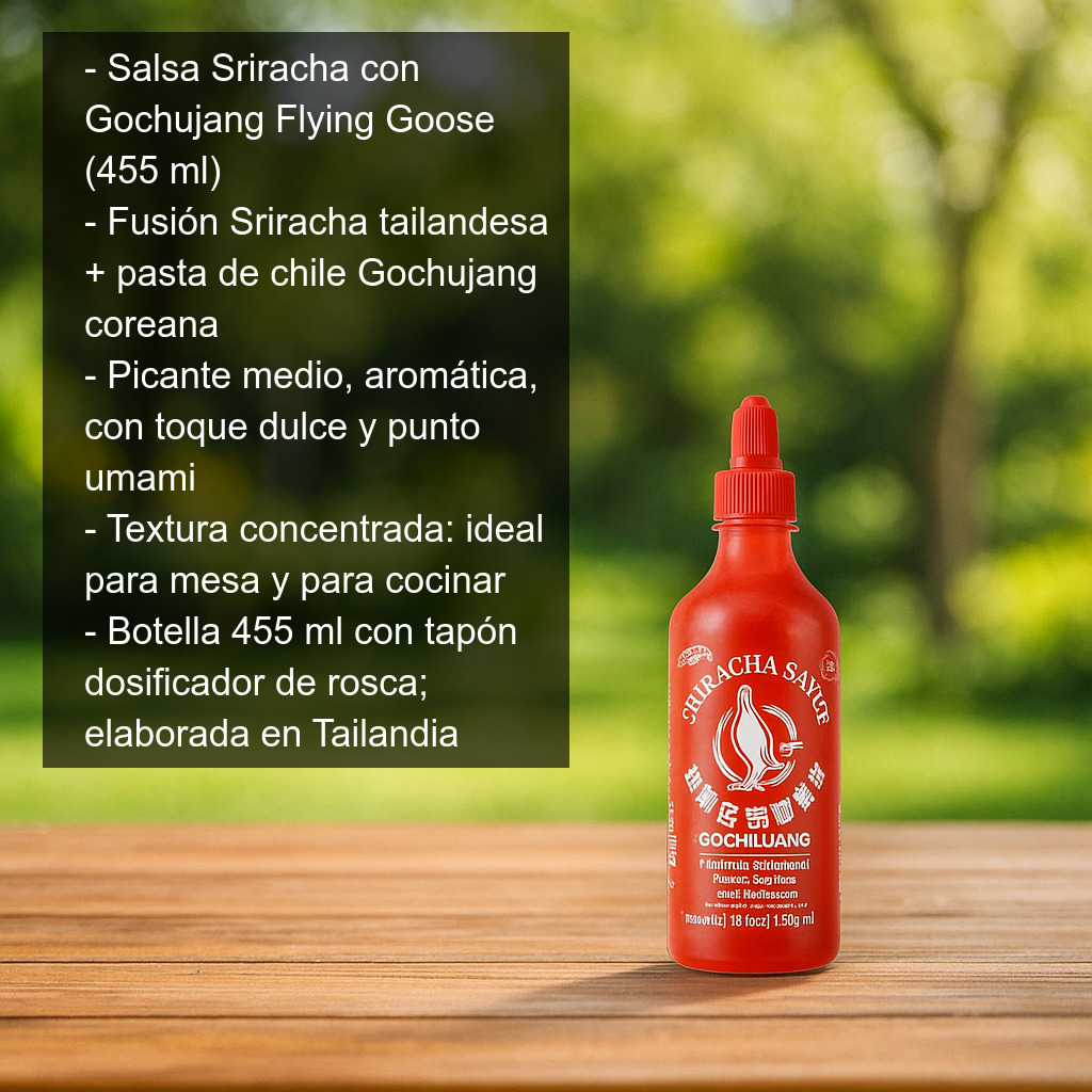 Producto de la marca Flying Goose, elaborado en Tailandia, reconocida por sus salsas picantes y condimentos asiáticos de gran calidad.