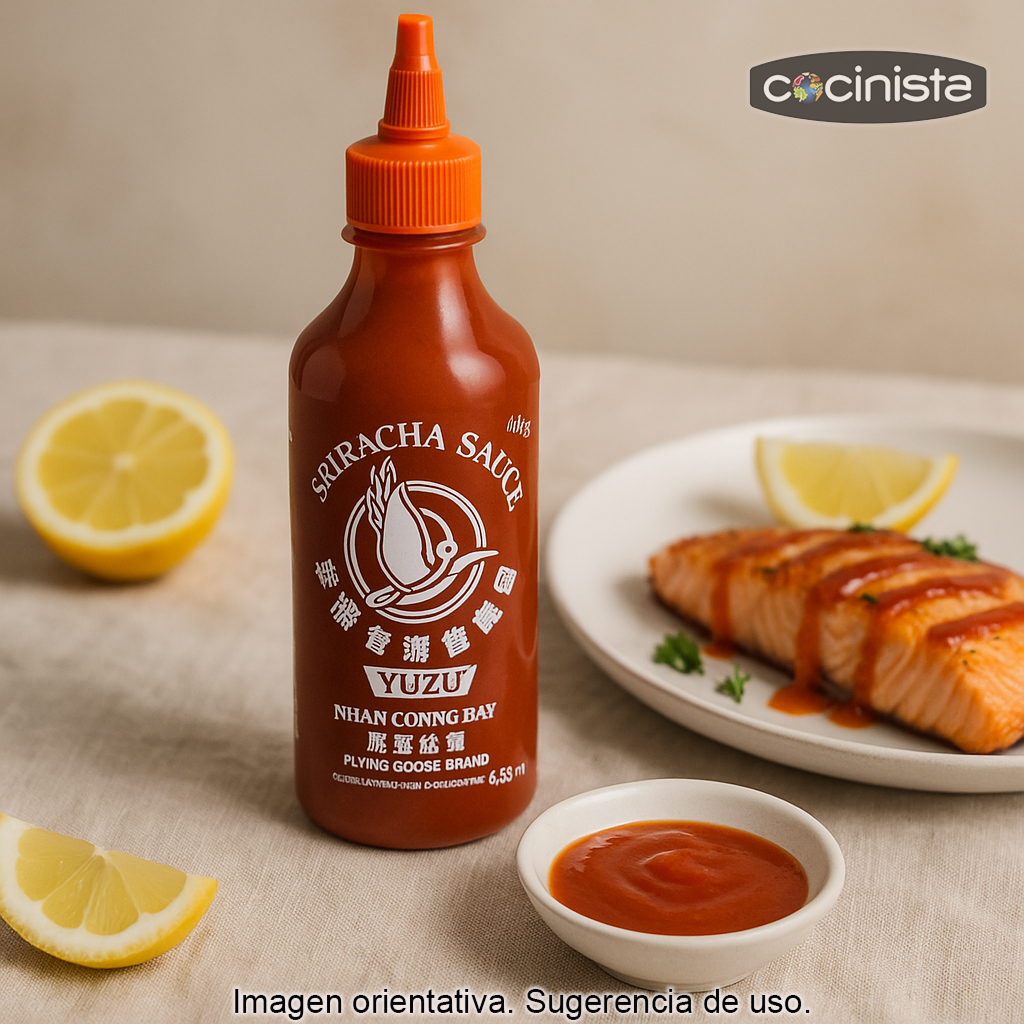 Gracias a su equilibrio entre chile y notas cítricas, esta sriracha es ideal para quienes buscan una salsa picante con más matices, menos “plana” y con un final refrescante. Aporta intensidad sin tapar el sabor del ingrediente principal, por eso funciona especialmente bien con pescados, mariscos y aves.