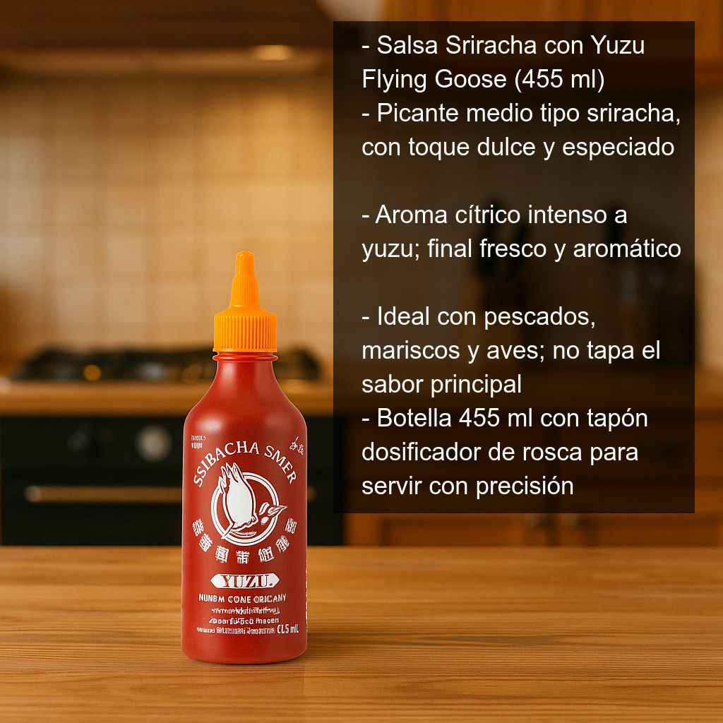 La Salsa Sriracha con Yuzu (455 ml) combina el picante característico de la sriracha tailandesa con el toque fresco y fragante del yuzu, un cítrico muy apreciado en la cocina japonesa y coreana por su aroma intenso y su sabor entre mandarina, lima y pomelo. El resultado es una salsa picante, cítrica y muy aromática, perfecta para dar un giro diferente a tus recetas de diario.