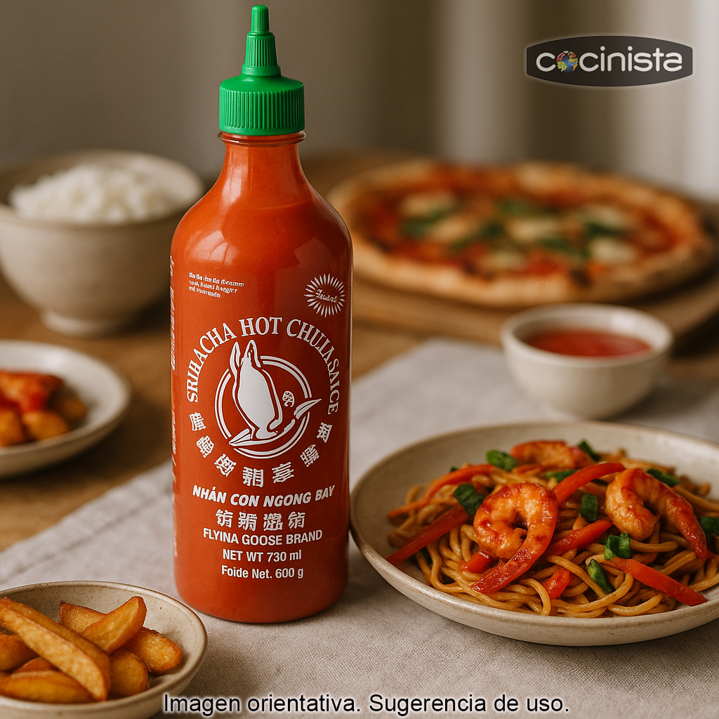 Formato grande de 730 ml con tapón dosificador, cómodo para uso frecuente en casa, barbacoas o cocina profesional. Un tamaño ideal si ya eres fan de la sriracha y la utilizas a diario.