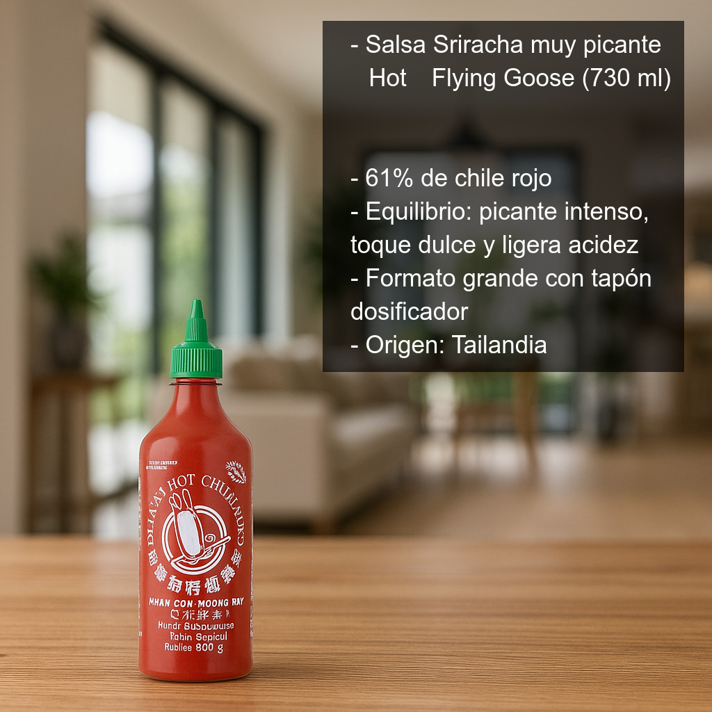 Esta versión “Hot” de Flying Goose (marca tailandesa reconocida internacionalmente) ofrece un nivel de picante alto para los estándares europeos: ideal si buscas una salsa picante potente para dar carácter a tus recetas. Si prefieres un picante todavía más extremo, puedes optar por la variante “Super Hot”.
