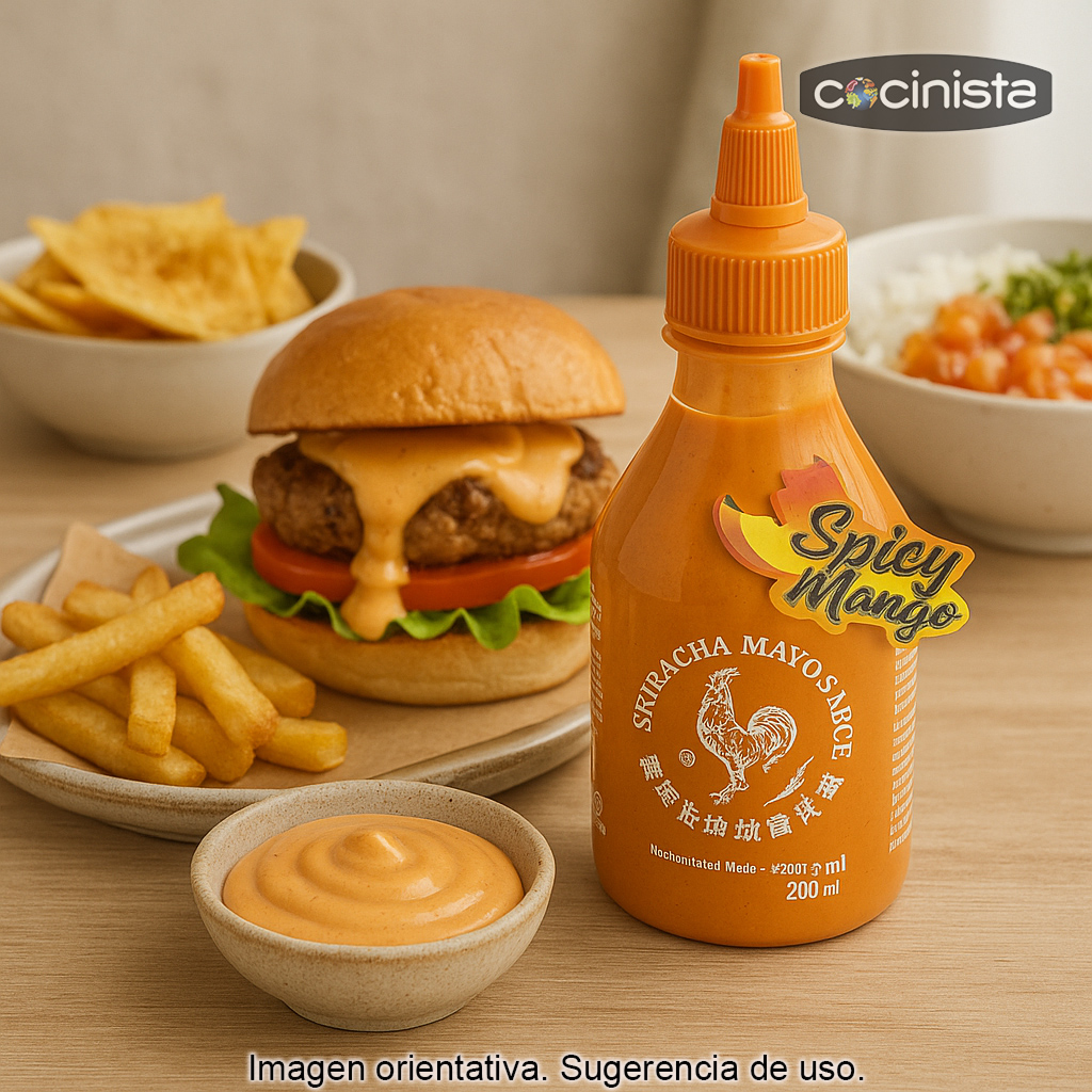 La Salsa Sriracha Mayo Picante (200 ml) combina el sabor inconfundible de la sriracha tailandesa con una mayonesa vegetal cremosa para conseguir una salsa intensa, equilibrada y con un picante alto. Su textura suave y su toque ligeramente dulce y avinagrado la convierten en un imprescindible para quienes buscan una mayo picante diferente, perfecta tanto para el día a día como para recetas más especiales.