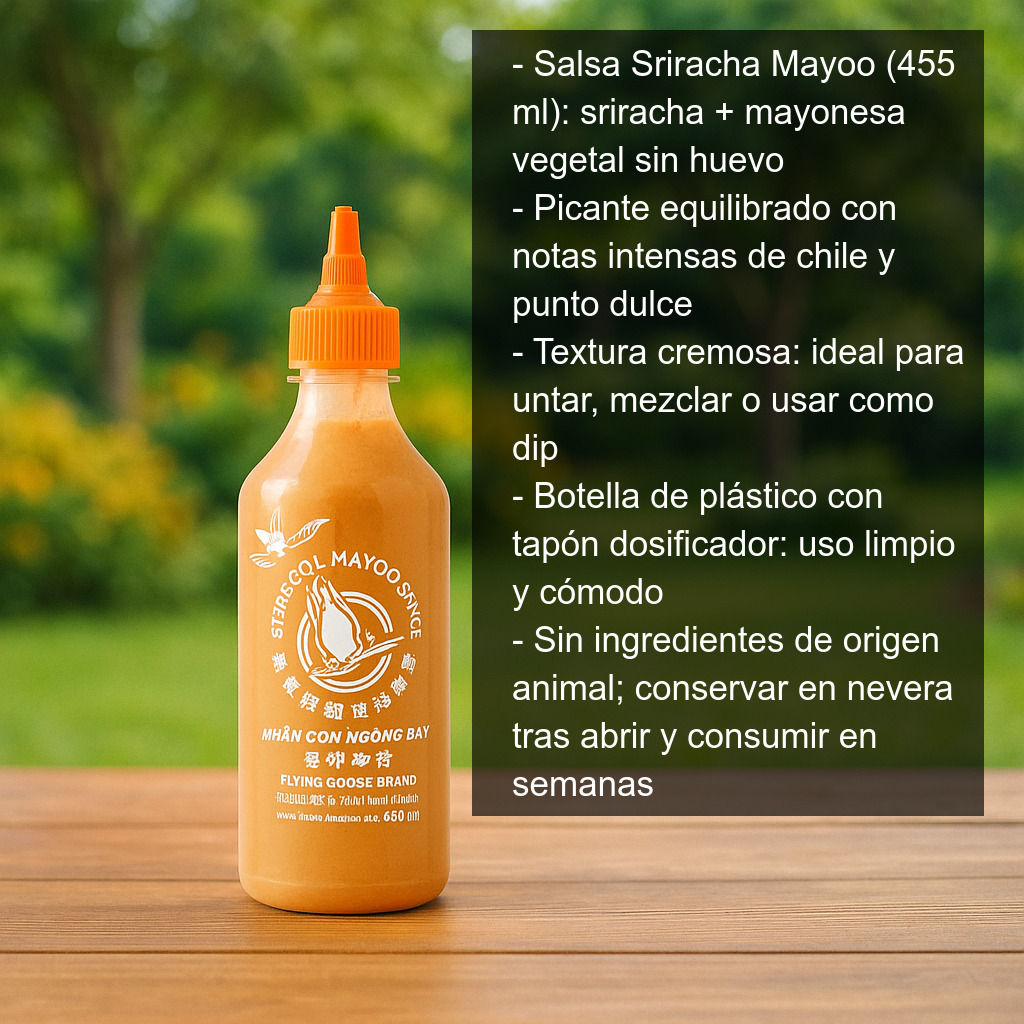 La Salsa Sriracha Mayoo (455 ml) combina el toque picante y aromático de la sriracha con la cremosidad de una mayonesa vegetal sin huevo. Elaborada a partir de chiles madurados al sol, ofrece un equilibrio perfecto entre intensidad, suavidad y un punto ligeramente dulce, ideal para quienes buscan una salsa versátil con carácter.