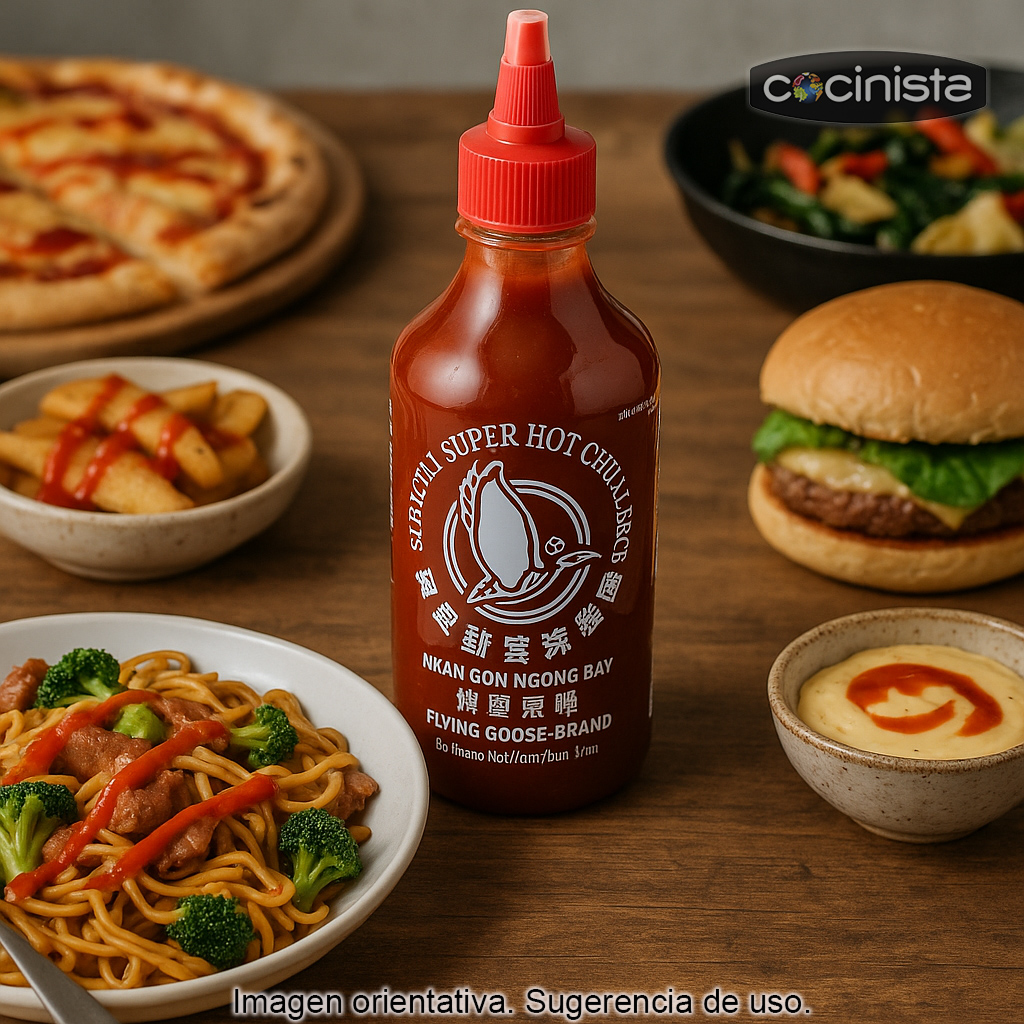 Su textura es suave y fácil de dosificar, con el característico sabor de la sriracha: un equilibrio entre el toque ligeramente dulce, el punto ácido y un final muy potente. Ideal para usar tanto en cocina como directamente en la mesa.