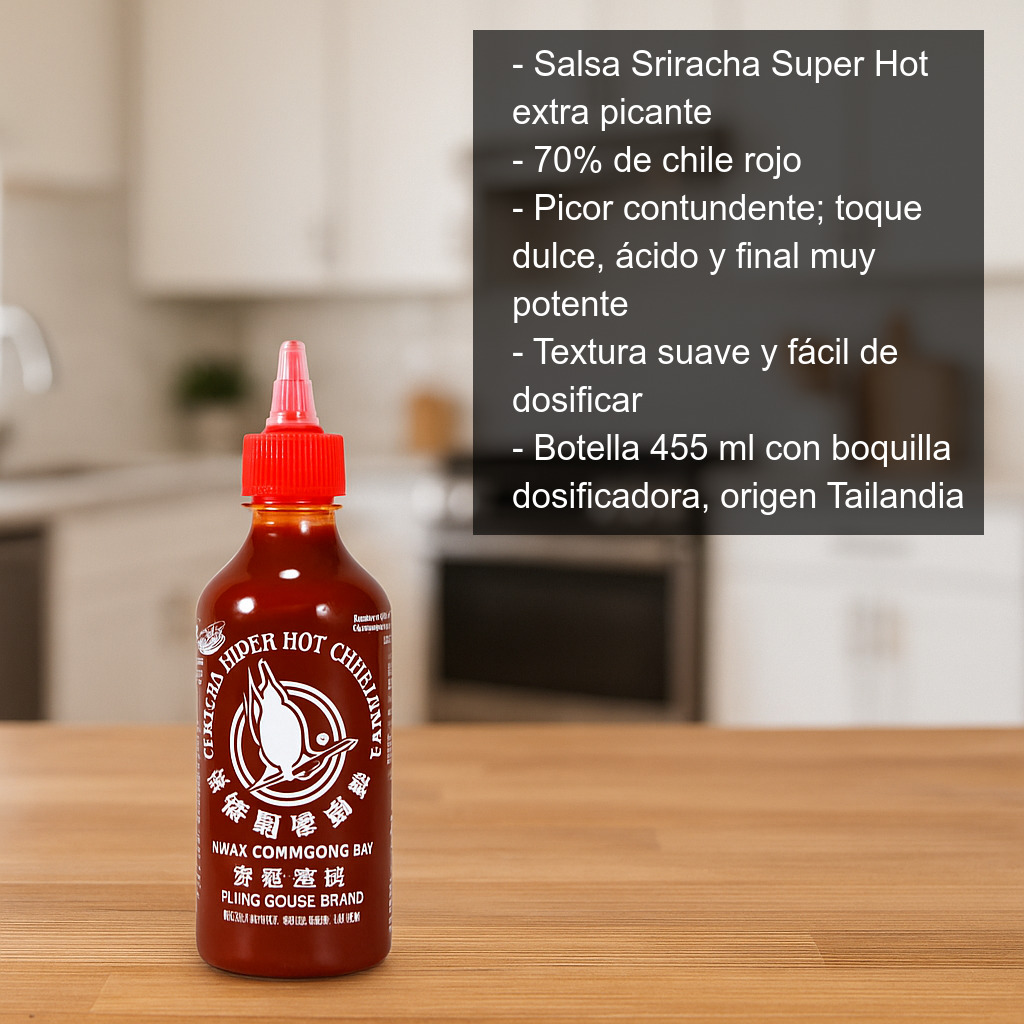 Salsa Sriracha Super Hot extra picante, elaborada con un impresionante 70% de chile rojo. Un condimento intenso, aromático y con un picor contundente, pensado solo para los más atrevidos y para quienes buscan llevar sus platos al siguiente nivel.