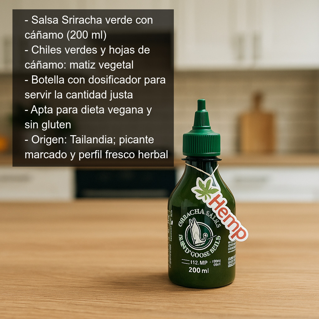 La Salsa Sriracha verde con cáñamo (200 ml) es una versión original y aromática de la clásica sriracha tailandesa, elaborada con chiles verdes y una pequeña cantidad de hojas de cáñamo que aporta un matiz vegetal y diferente. Ideal para quienes buscan una salsa picante con personalidad, perfecta para dar un toque intenso a tus platos del día a día.