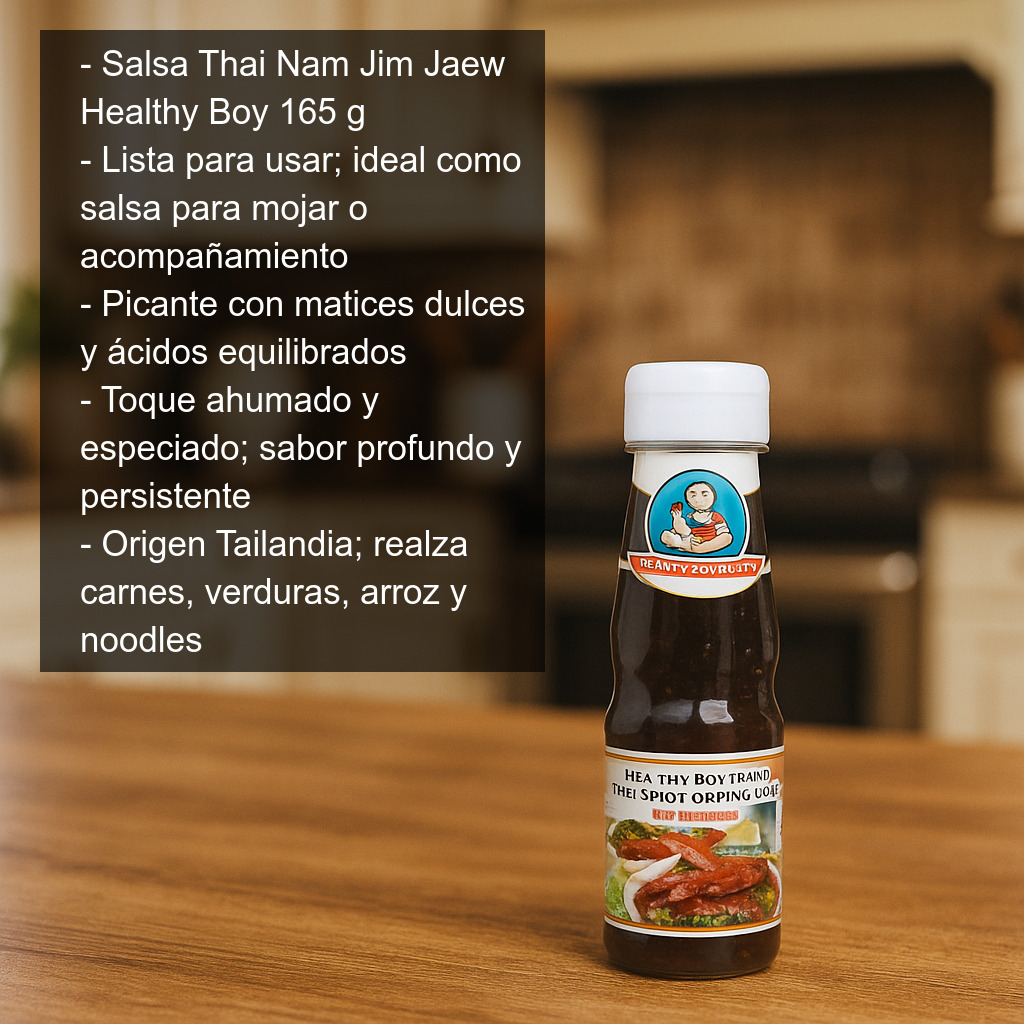 Salsa Thai (Nam Jim Jaew) 165 g lista para usar, ideal como dipping (salsa para mojar) o como acompañamiento para dar a tus platos un auténtico toque de cocina tailandesa. Esta salsa tradicional de Tailandia destaca por su equilibrio de sabores: picante para los amantes de las salsas con carácter, con matices dulces y ácidos y un agradable toque ahumado que realza carnes, verduras y platos a la parrilla.