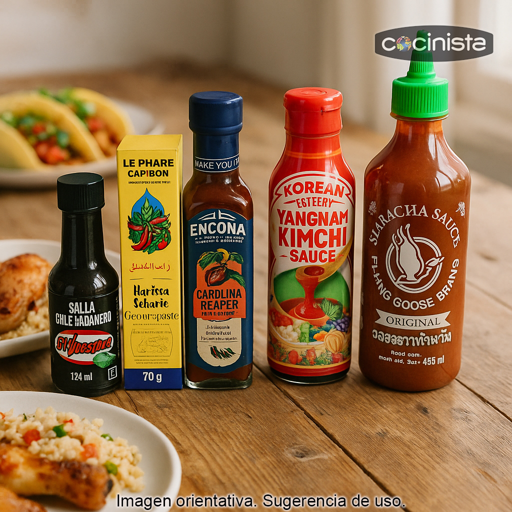 Consejo de uso: si quieres disfrutar de todos los matices, prueba cada salsa por separado y luego juega con combinaciones (por ejemplo, sriracha mayonesa, harissa aceite de oliva, o habanero ahumado en guisos). Así encontrarás tu nivel de picante ideal y el maridaje perfecto para cada plato.