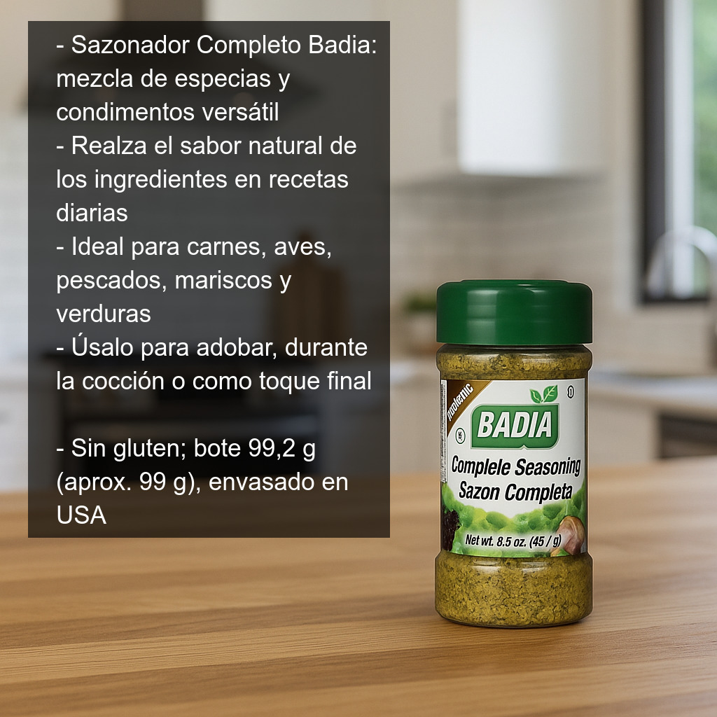 El Sazonador Completo Badia es una mezcla de especias y condimentos pensada para aportar un toque sabroso y equilibrado a tus recetas del día a día, realzando el sabor natural de los ingredientes sin complicaciones. Ideal para quienes buscan un condimento versátil que funcione igual de bien en platos rápidos como en elaboraciones más completas.