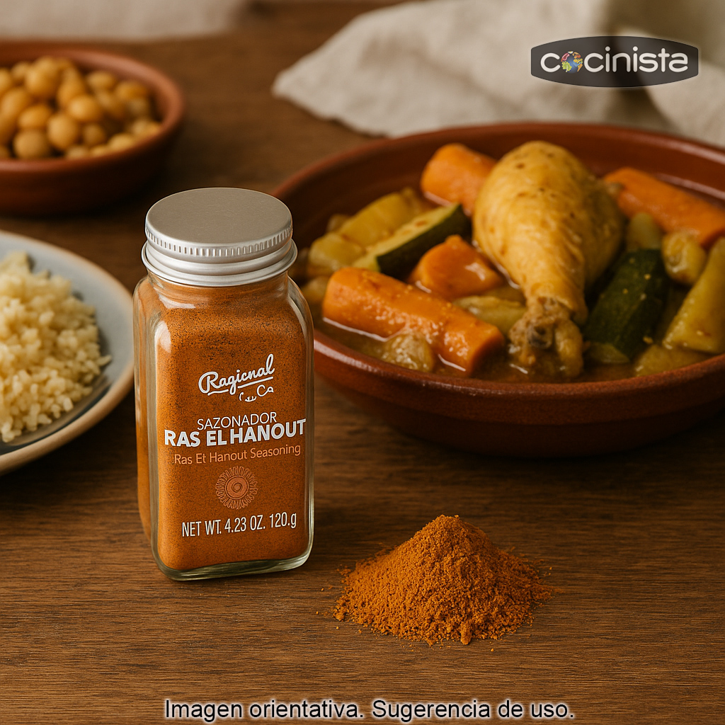 Este producto se presenta en frasco de cristal con 65 g de sazonador Ras el Hanout, ideal para conservar mejor el aroma y tenerlo siempre a mano en tu cocina.