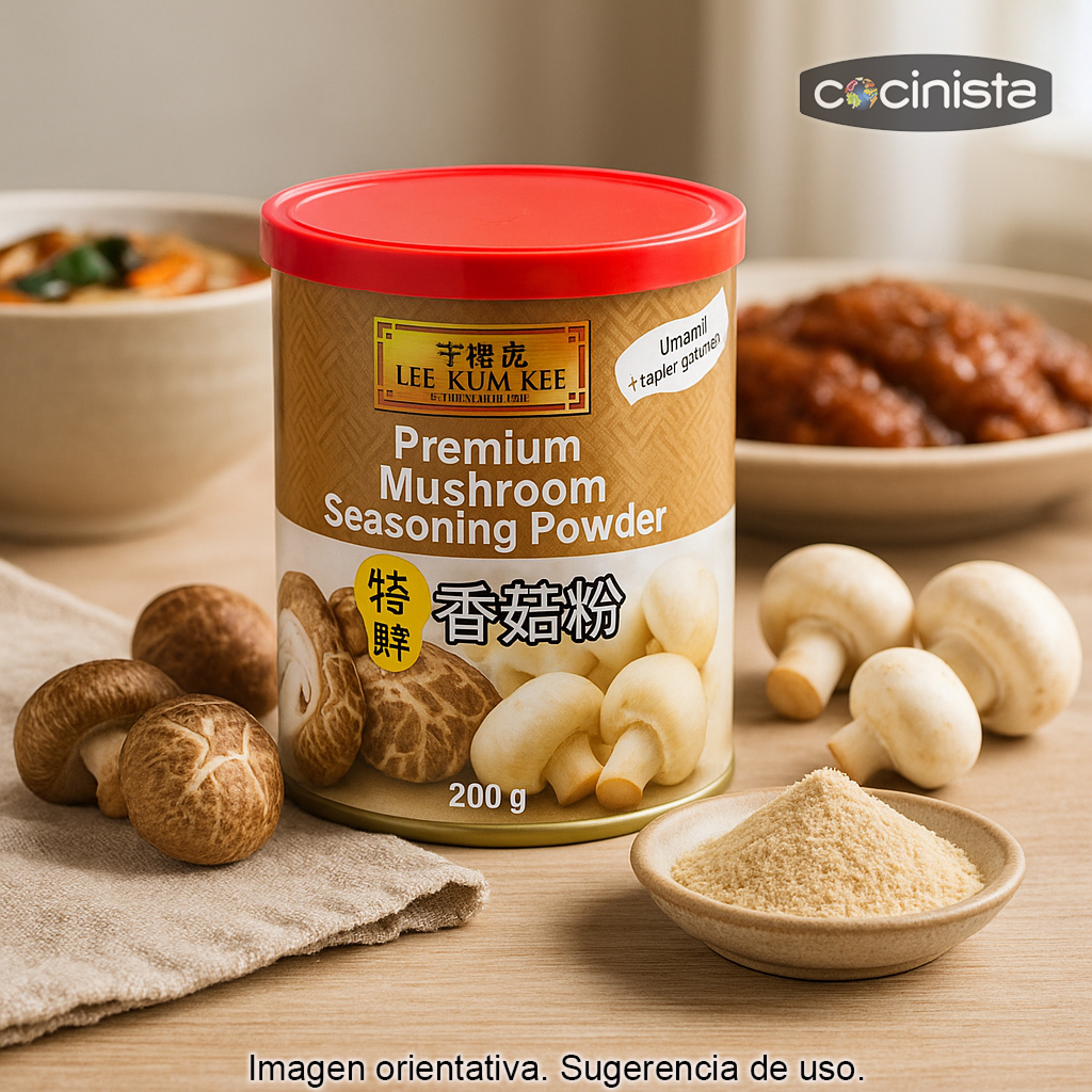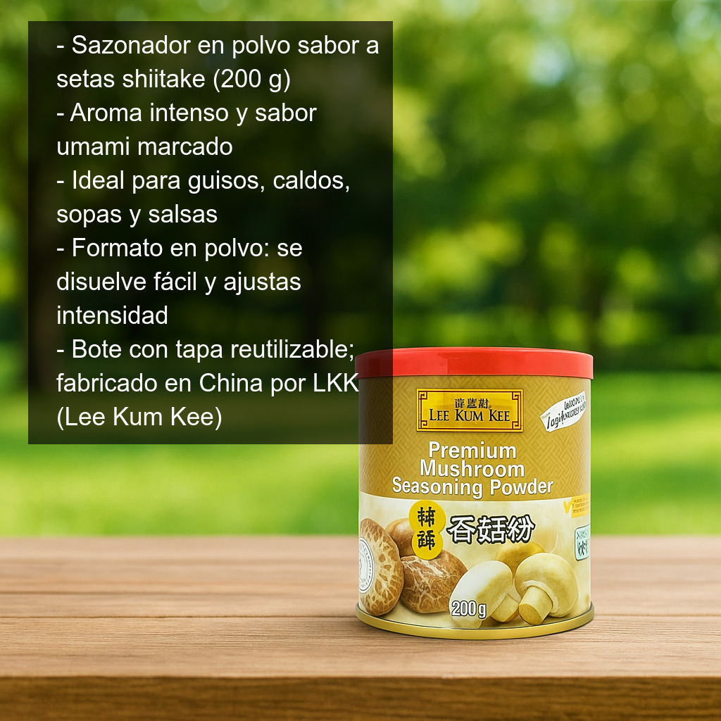 Sazonador en polvo sabor a setas shiitake (200 g), elaborado a partir de shiitake y otros ingredientes seleccionados para aportar a tus recetas un aroma intenso y un delicioso sabor umami. Es un aliado perfecto para realzar guisos, caldos y salsas, aportando profundidad y un toque “de cocina asiática” sin complicaciones.