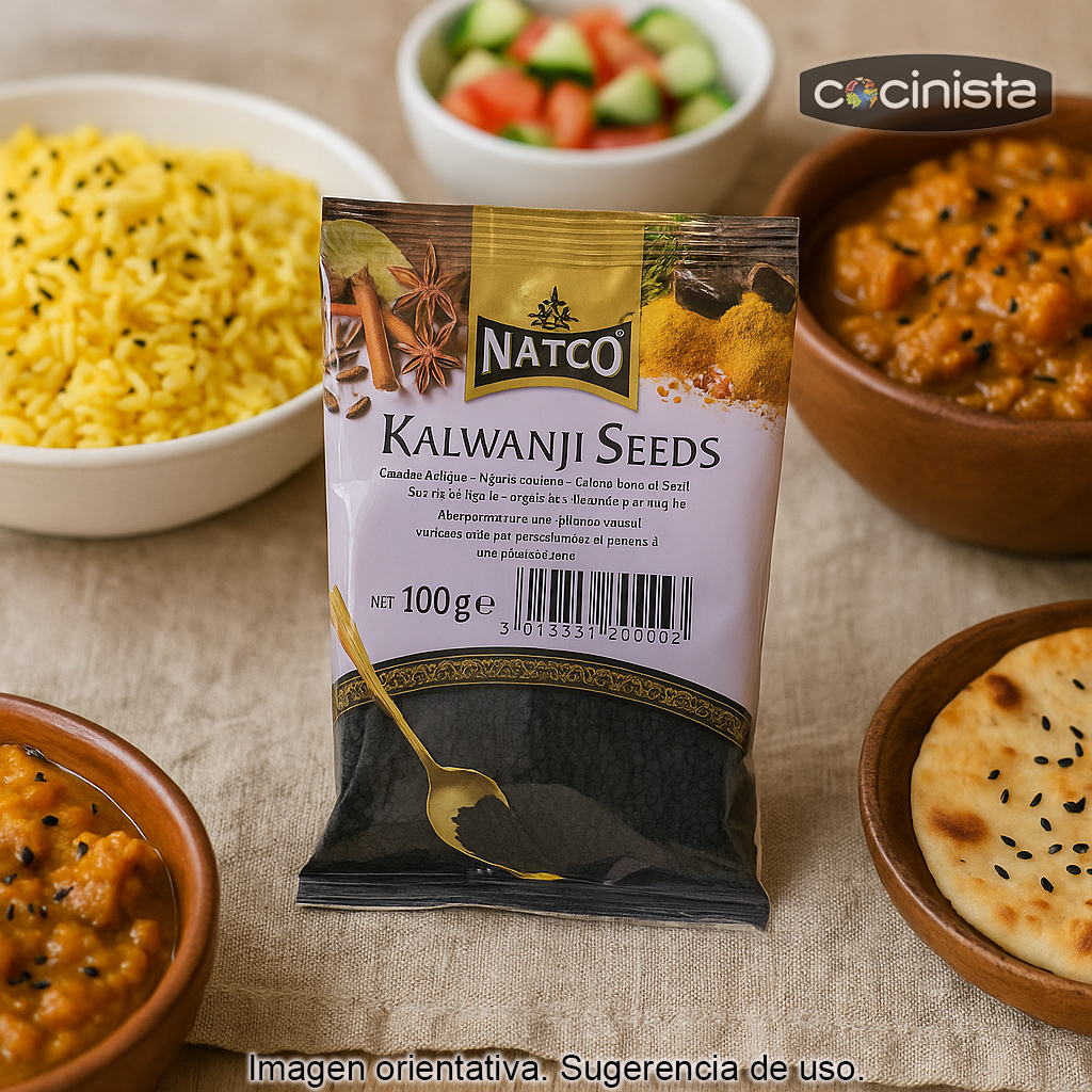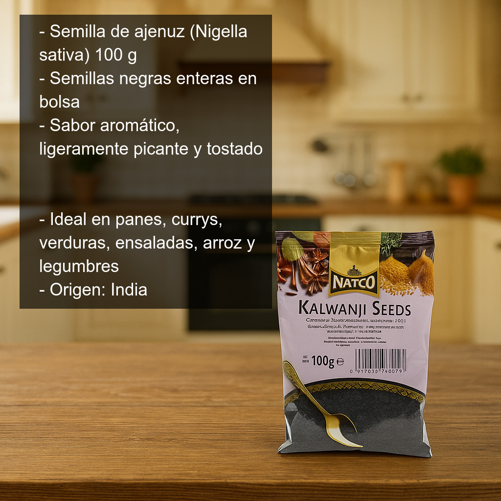 La semilla de ajenuz (Nigella sativa), conocida también como semilla de nigella o kalwanji, es una especia imprescindible en la cocina de la India y de Oriente Medio. A menudo se confunde con las “semillas de cebolla” por su aspecto, pero su sabor es propio: aromático, ligeramente picante, con notas que recuerdan a la pimienta y un toque tostado.