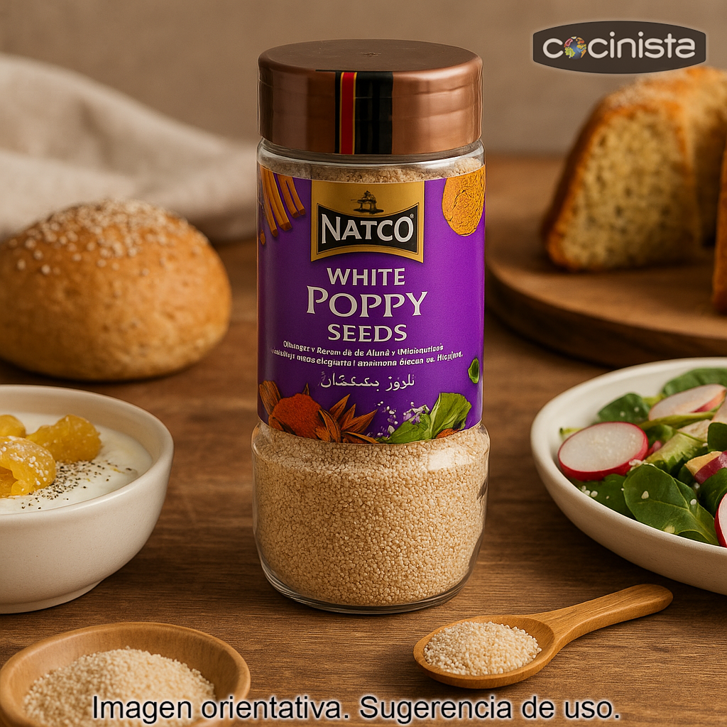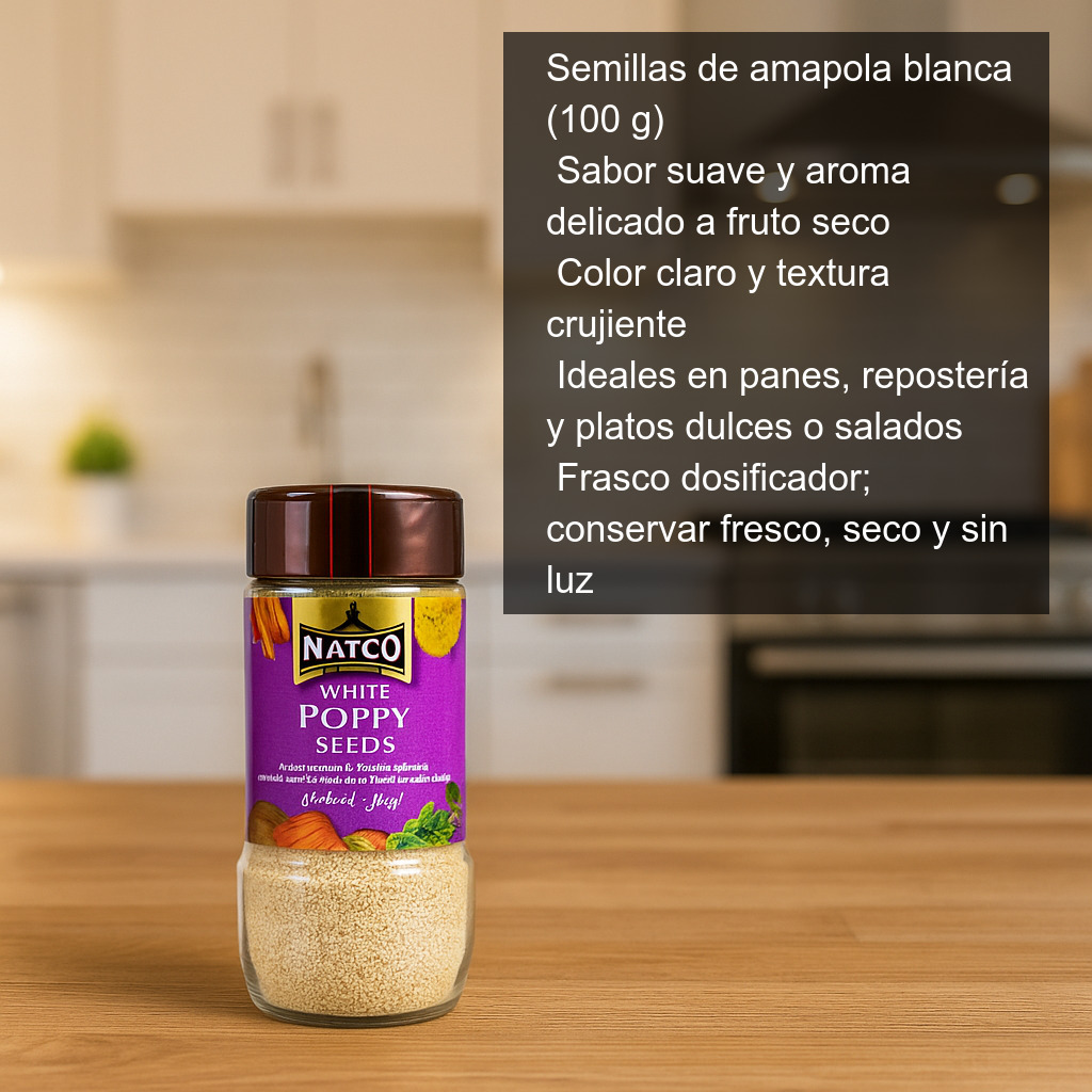 Semillas de amapola blanca (100 g), un ingrediente muy apreciado en la cocina de la India y en repostería por su sabor suave y su aroma delicado a fruto seco. Menos habituales que las semillas de amapola negra, las amapolas blancas destacan por su color claro y por aportar una textura crujiente que realza tanto recetas dulces como saladas.