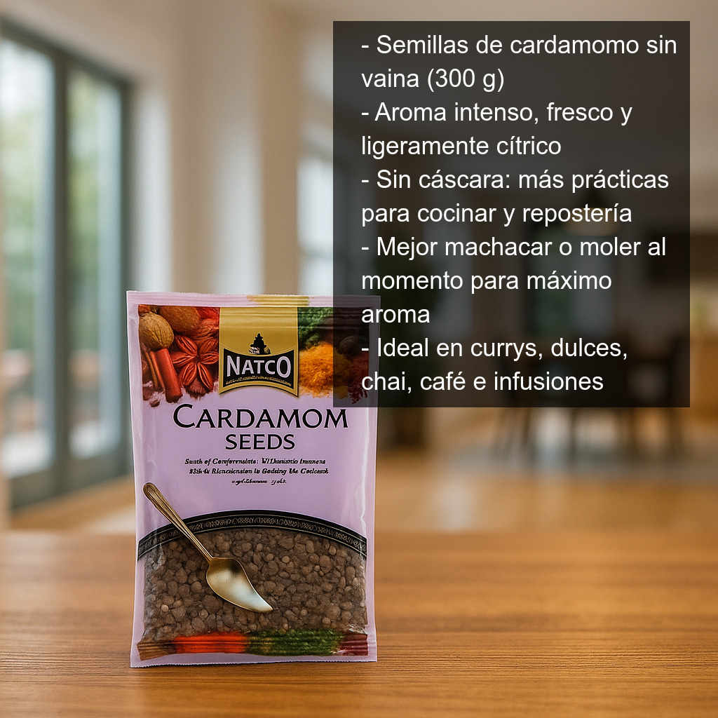 Estas semillas de cardamomo sin vaina se presentan en bolsa de 300 g, ideal para uso frecuente en cocina, repostería y preparaciones especiadas.