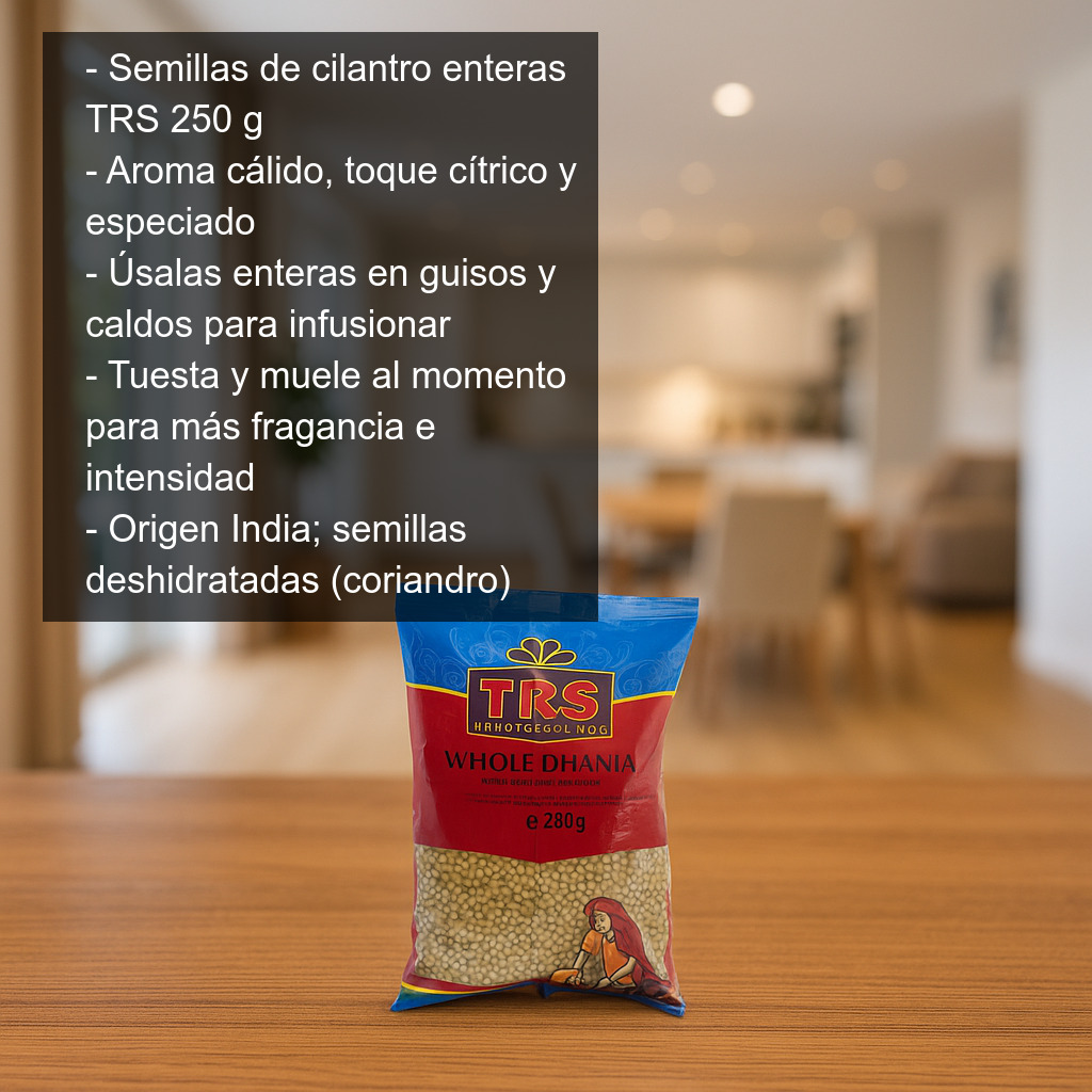 Semillas de cilantro enteras (también conocidas como coriandro) deshidratadas, presentadas en bolsa de 250 g de la marca TRS. Esta especia es un básico imprescindible en la cocina india y en muchas recetas mexicanas, y destaca por su aroma cálido y su característico toque cítrico y especiado.
