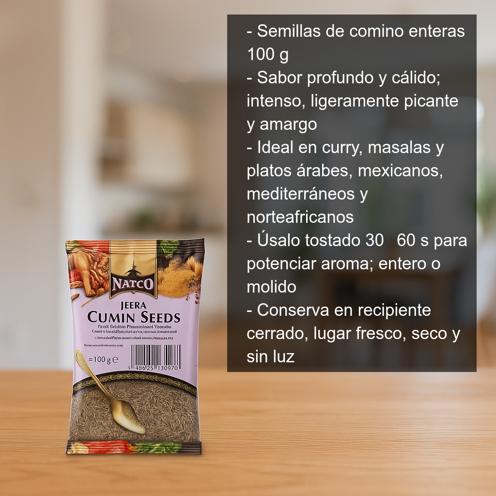 Este comino se presenta entero (en grano/semilla), en bolsa con 100 g de producto, ideal para conservar mejor su aroma y utilizarlo tanto entero como molido según la receta.