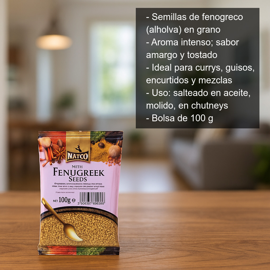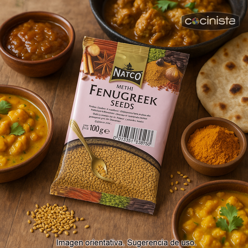 En la cocina india, el fenogreco es un ingrediente habitual en mezclas de curry y masalas, y destaca especialmente en recetas con personalidad como el curry Vindaloo. También se utiliza con frecuencia en chutneys, encurtidos y preparaciones especiadas donde se busca un toque aromático y ligeramente tostado.