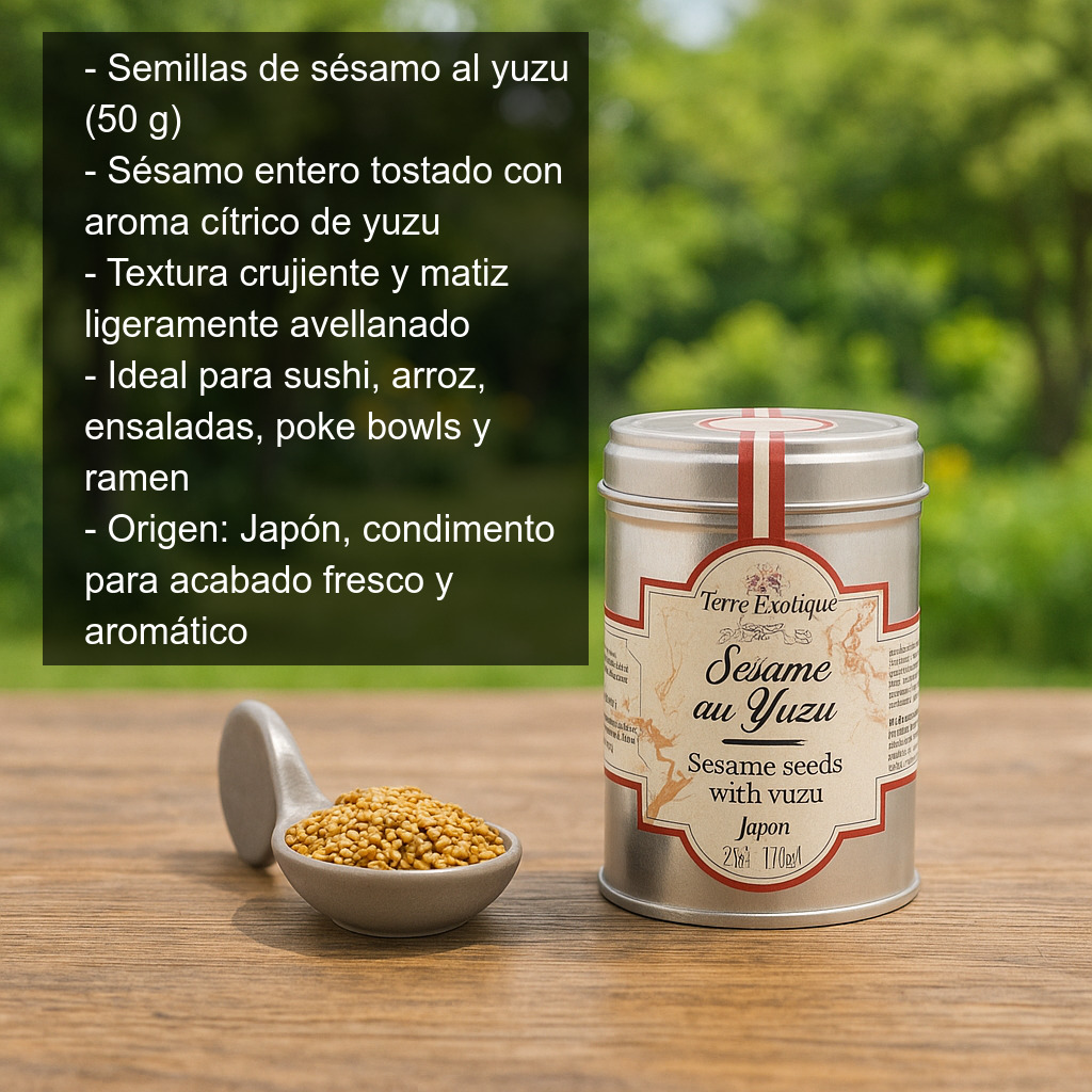 Las semillas de sésamo al yuzu (50 g) son un condimento japonés ideal para aportar a tus recetas un toque cítrico, fresco y aromático sin complicaciones. Esta mezcla combina semillas de sésamo enteras cuidadosamente tostadas con el inconfundible perfume del yuzu, un cítrico japonés muy apreciado por su sabor entre limón, mandarina y pomelo.