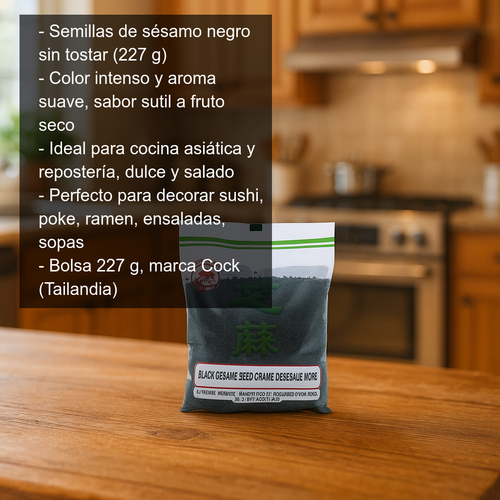 Este sésamo negro se presenta en bolsa de 227 g. Es de la marca tailandesa Cock.