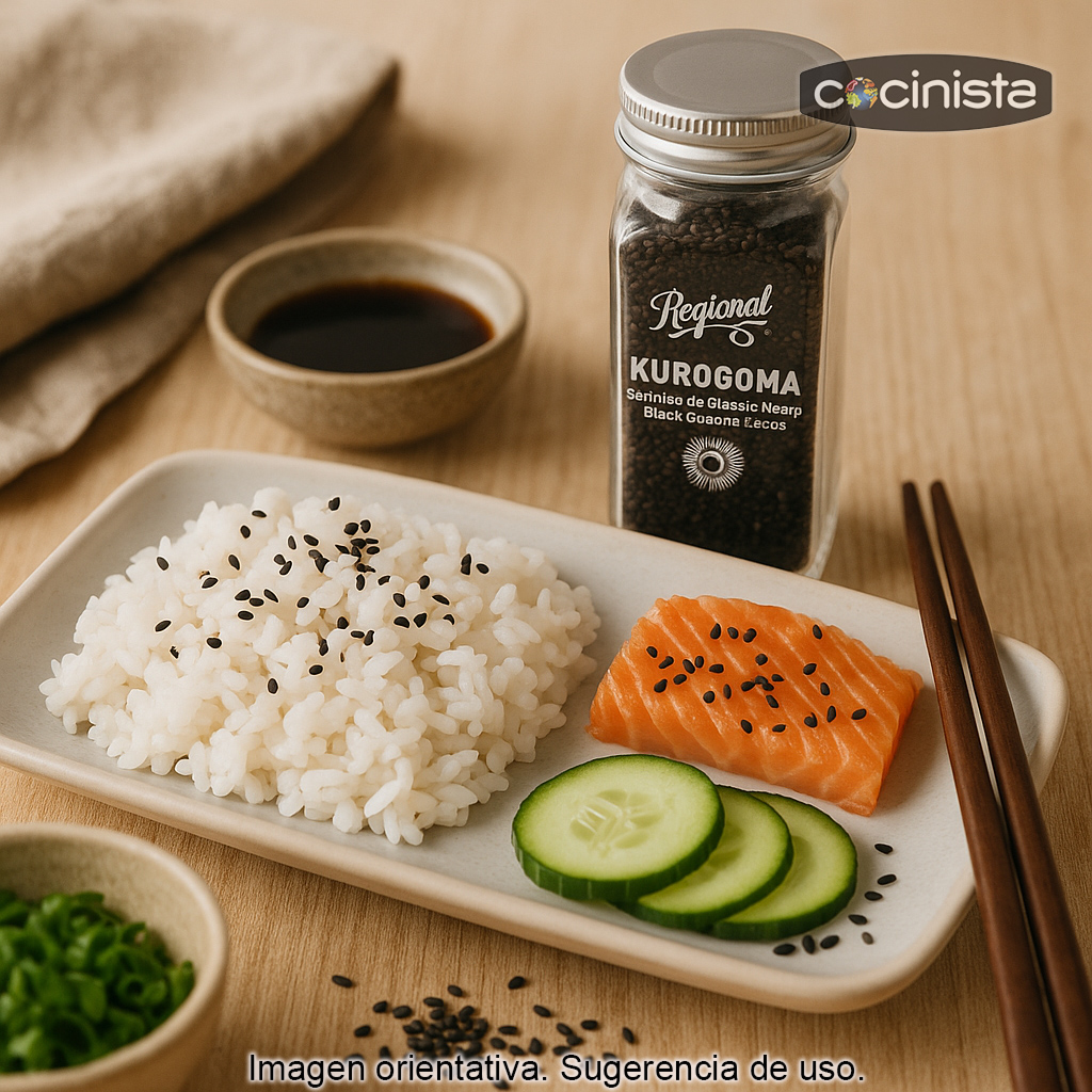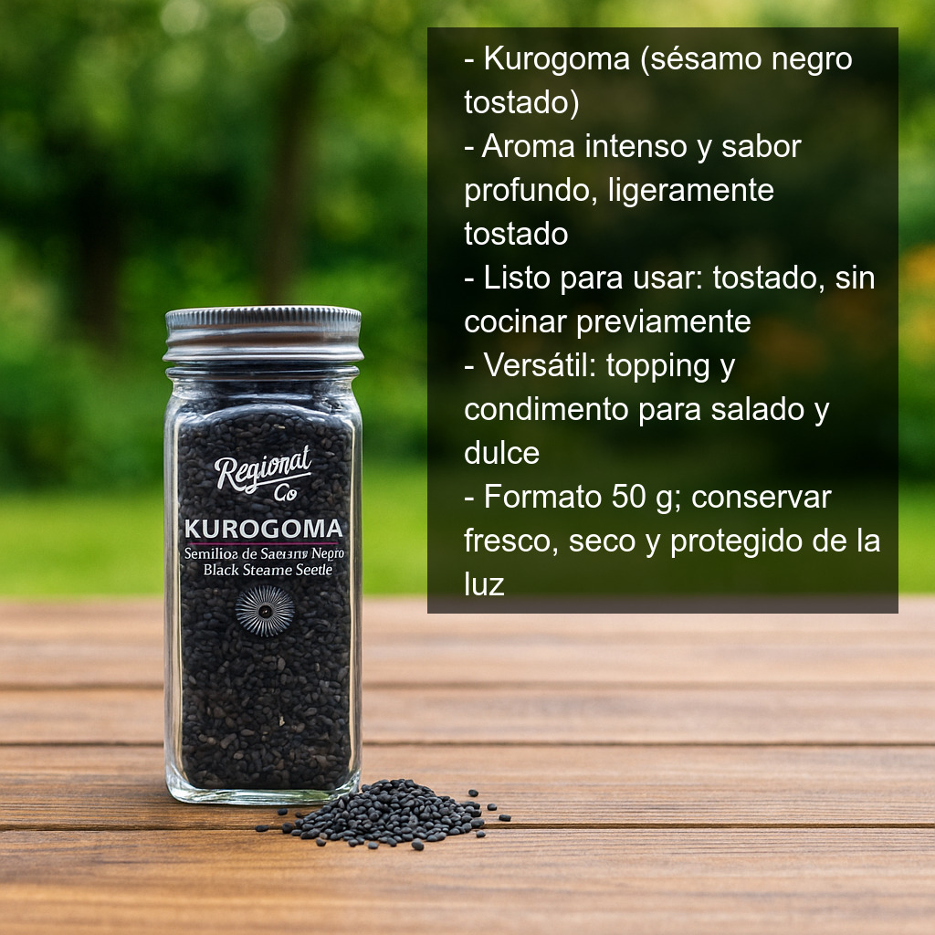 El Kurogoma es un ingrediente tradicional de la cocina japonesa elaborado con semillas de sésamo negro tostadas. Su aroma es intenso y su sabor, profundo y ligeramente tostado, ideal para dar un toque final crujiente y muy sabroso a todo tipo de platos. En España también se conoce como ajonjolí, y en su versión negra destaca por su carácter más marcado y su color elegante, perfecto para decorar y realzar presentaciones.