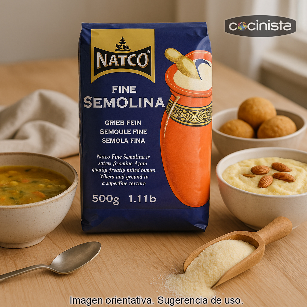 La sémola de trigo fina Natco (semolina) es una sémola de textura superfina, ideal para quienes buscan un ingrediente versátil en la cocina diaria y en la repostería tradicional. Gracias a su molienda fina, se integra con facilidad en líquidos y masas, aportando cuerpo, suavidad y una textura agradable a numerosas preparaciones.