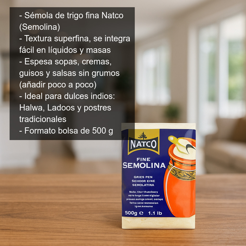 Esta semolina fina se utiliza habitualmente para espesar sopas, cremas, guisos y salsas, ya que ayuda a ligar el caldo sin formar grumos si se incorpora poco a poco. También es un ingrediente muy apreciado en la cocina del sur de Asia para elaborar dulces indios y postres tradicionales como Halwa o Ladoos, donde aporta una miga delicada y un resultado más homogéneo.