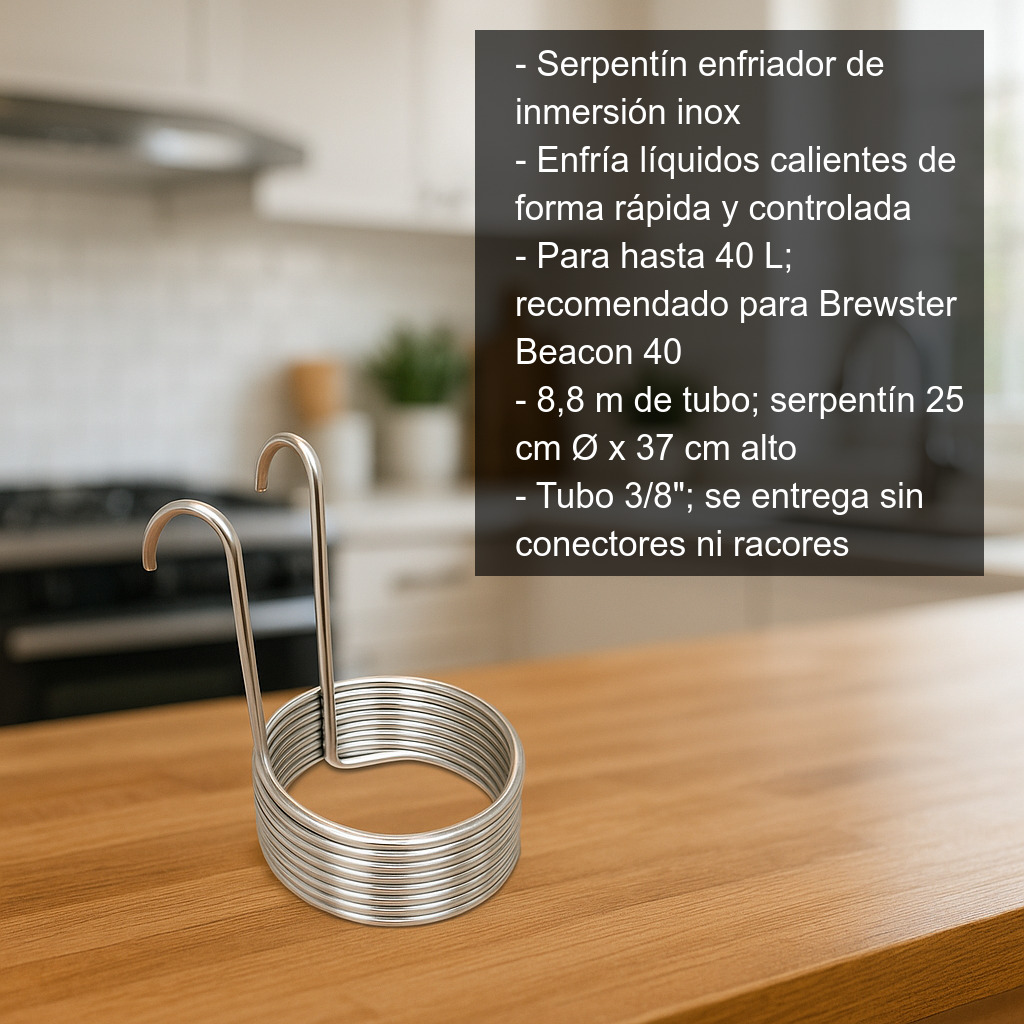 Este serpentín enfriador es un enfriador de inmersión fabricado en acero inoxidable, diseñado para acelerar el enfriado de líquidos calientes de forma eficiente y segura. Es una solución ideal para quienes buscan un enfriado rápido y controlado en procesos como la elaboración de cerveza artesana, la preparación de mostos, caldos o cualquier elaboración en la que sea importante bajar la temperatura en poco tiempo. Está recomendado para la Brewster Beacon 40, pero podrías usarlo en aparatos similares, para enfriar hasta 40 litros de mosto.